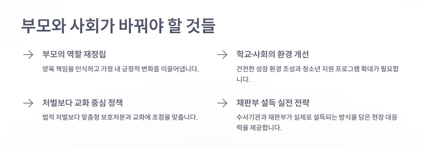 | • 왜 소년 비행과 범죄는 반복·증가하는가 • 왜 독방·컴퓨터·스마트폰 구조가 위험한가 • 왜 심리검사 결과가 오히려 유리한 증거가 될 수 있는가 • 왜 치료는 ‘나중’이 아니라 ‘지금’ 시작해야 하는가 • 왜 부모도 종합심리검사를 받아야 하는가 • 무엇을 바꾸면 재판부의 판단이 실제로 달라지는가 |