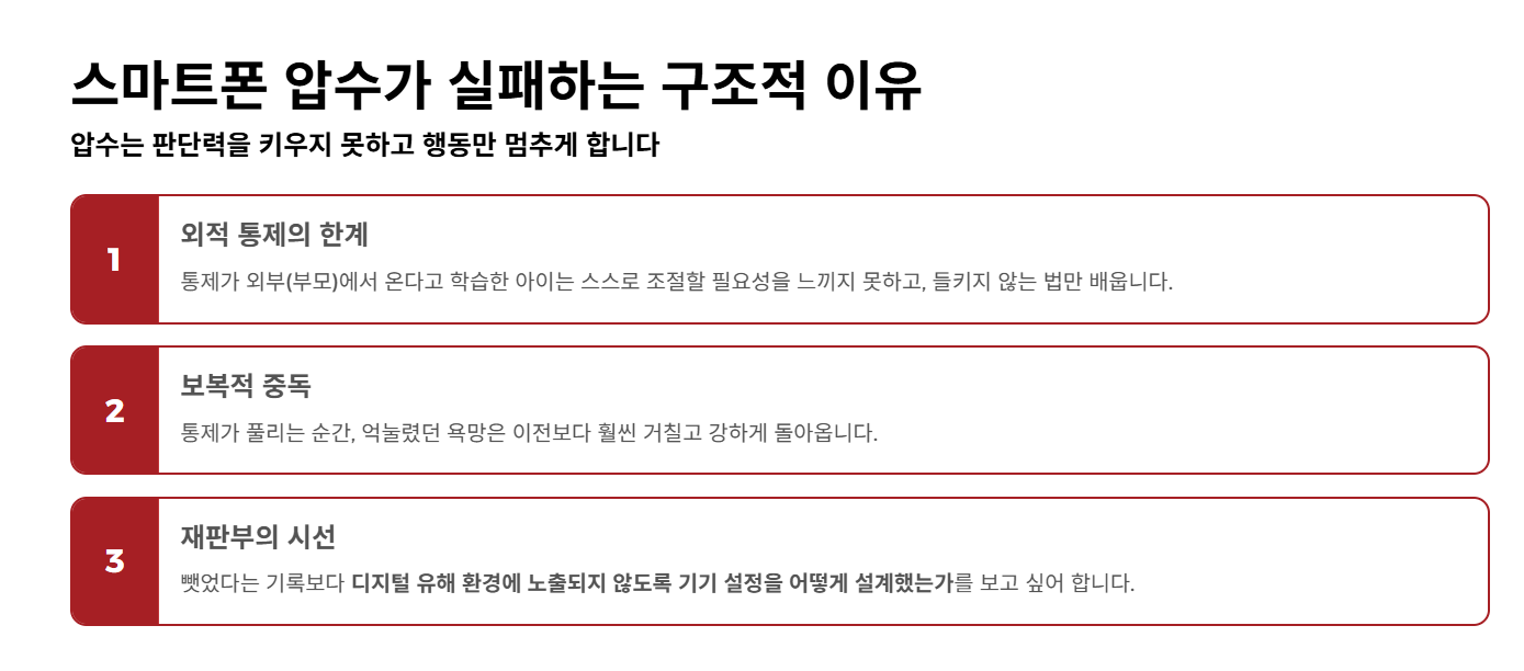 재판부는 일시적인 압수를 근본적인 해결책으로 보지 않습니다. 오히려 부모가 아이의 디지털 환경에 대한 이해와 설계 능력이 부족하다고 판단할 위험이 있습니다. 재판부가 보고 싶어 하는 것은 뺏었다는 기록이 아니라, "아이가 자극적인 알고리즘이나 유해 광고에 노출되지 않도록 기기 설정을 어떻게 변경했고, 어떤 합의된 규칙을 세웠는가" 하는 구조적 대응입니다.