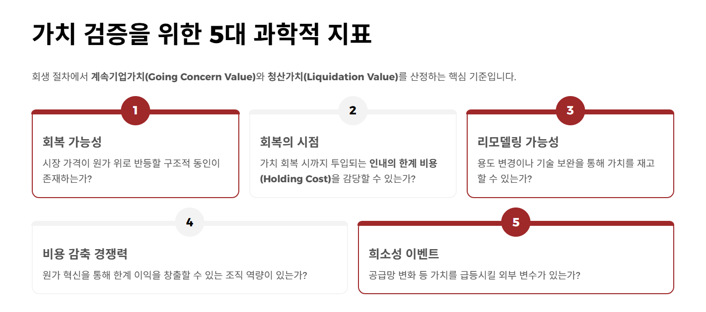변호사로서 제가 법리를 검토할 때 가장 중요하게 여기는 것은 ‘예측 가능성’입니다. 부실 자산의 가치 회복 가능성을 평가하기 위해 우리는 다음의 5대 지표를 면밀히 살펴야 한다고 생각합니다.