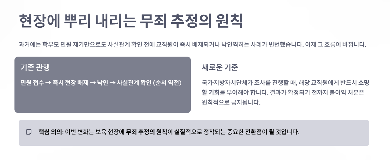 과거에는 학부모의 민원 제기만으로도 사실관계 확인 전에 교직원이 현장에서 즉시 배제되거나 낙인찍히는 사례가 빈번했습니다.