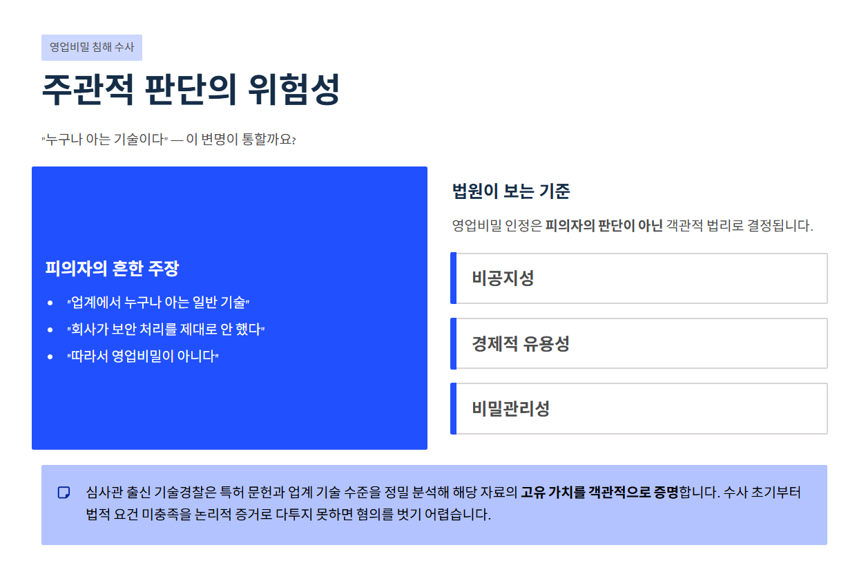 기술유출 및 영업비밀 침해 혐의로 조사실에 앉은 피의자들이 가장 흔히 제기하는 주장은 "이건 업계에서 누구나 아는 일반적인 기술이다" 혹은 "회사에서 보안 처리를 제대로 하지 않았으니 영업비밀이 아니다"라는 것입니다.