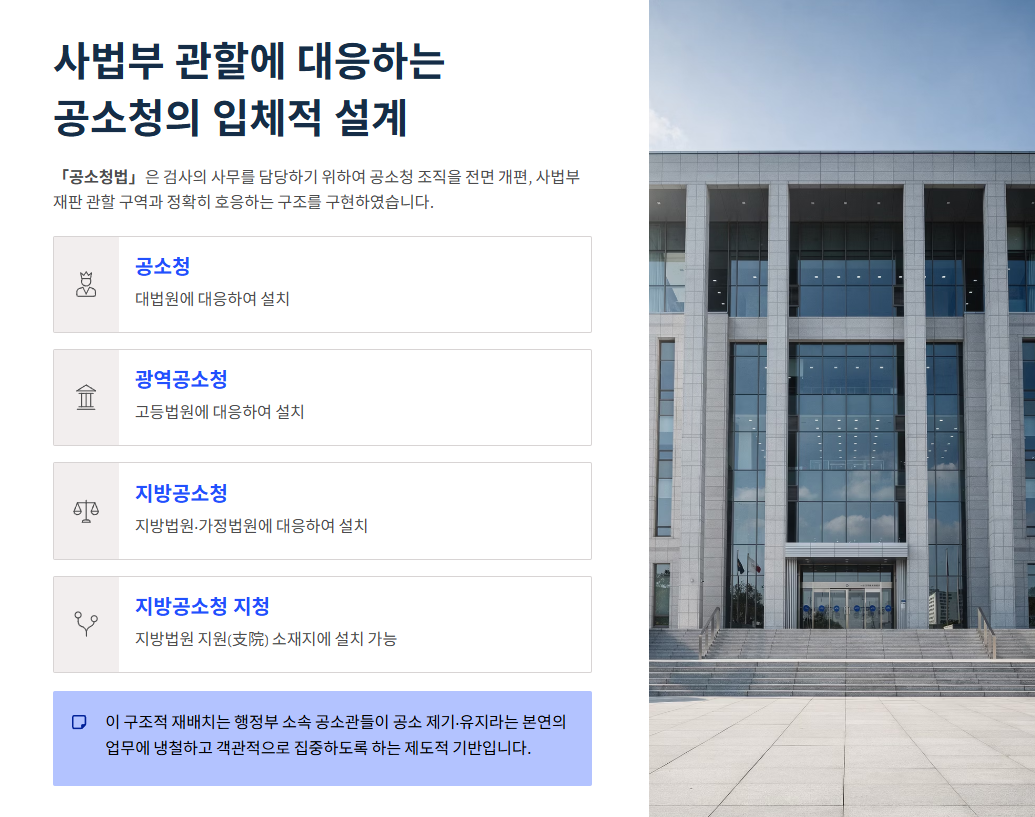 이는 행정부 소속인 공소관들이 사법부의 재판 관할 구역과 정확히 호흡을 맞추어, 공소 제기와 유지라는 본연의 업무에 차갑고도 객관적으로 집중하도록 만드는 구조적 재배치입니다.