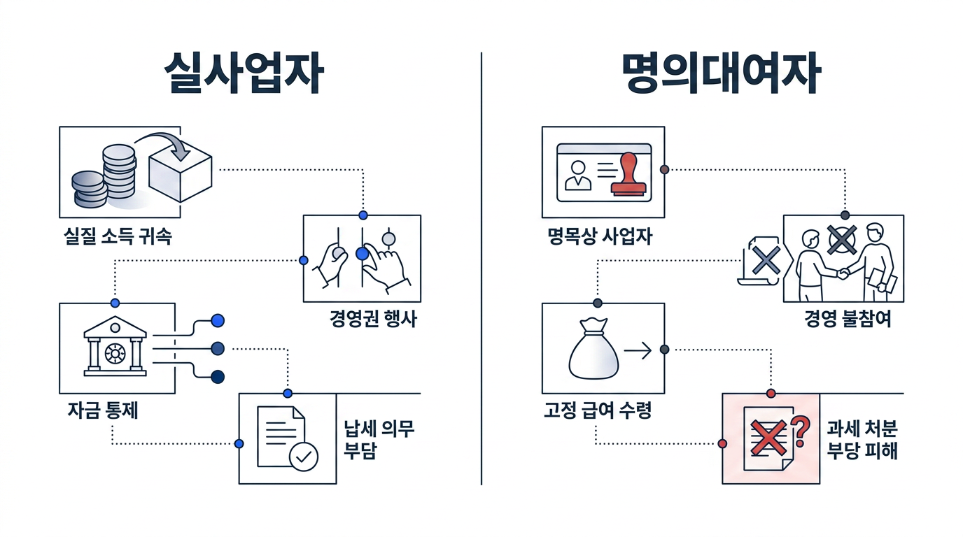외관상으로는 명의를 빌려준 사람이 해당 사업체의 대표이자 모든 법적·경제적 권리와 의무의 주체로 보입니다. 따라서 과세관청이나 거래처는 실제 운영자가 누구인지 모르는 상태에서는 당연히 명의상 대표자인 사람에게 세금과 채무에 대한 책임을 묻게 됩니다.