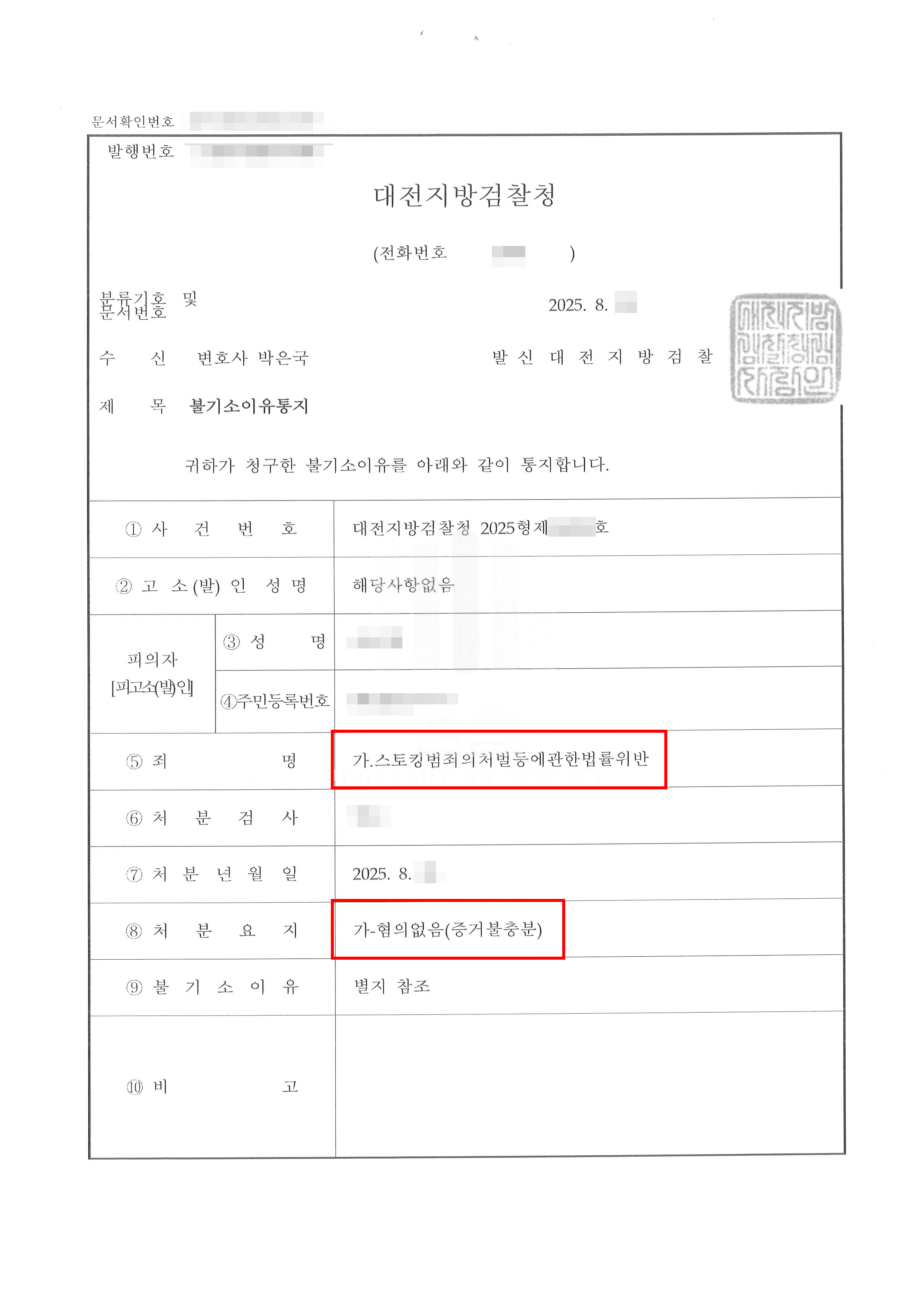무혐의 | 스토킹처벌법위반 고소당하여 경찰에서 혐의인정되어 기소의견으로 송치되었으나 검찰에서 혐의없음 불기소처분 받은 사례