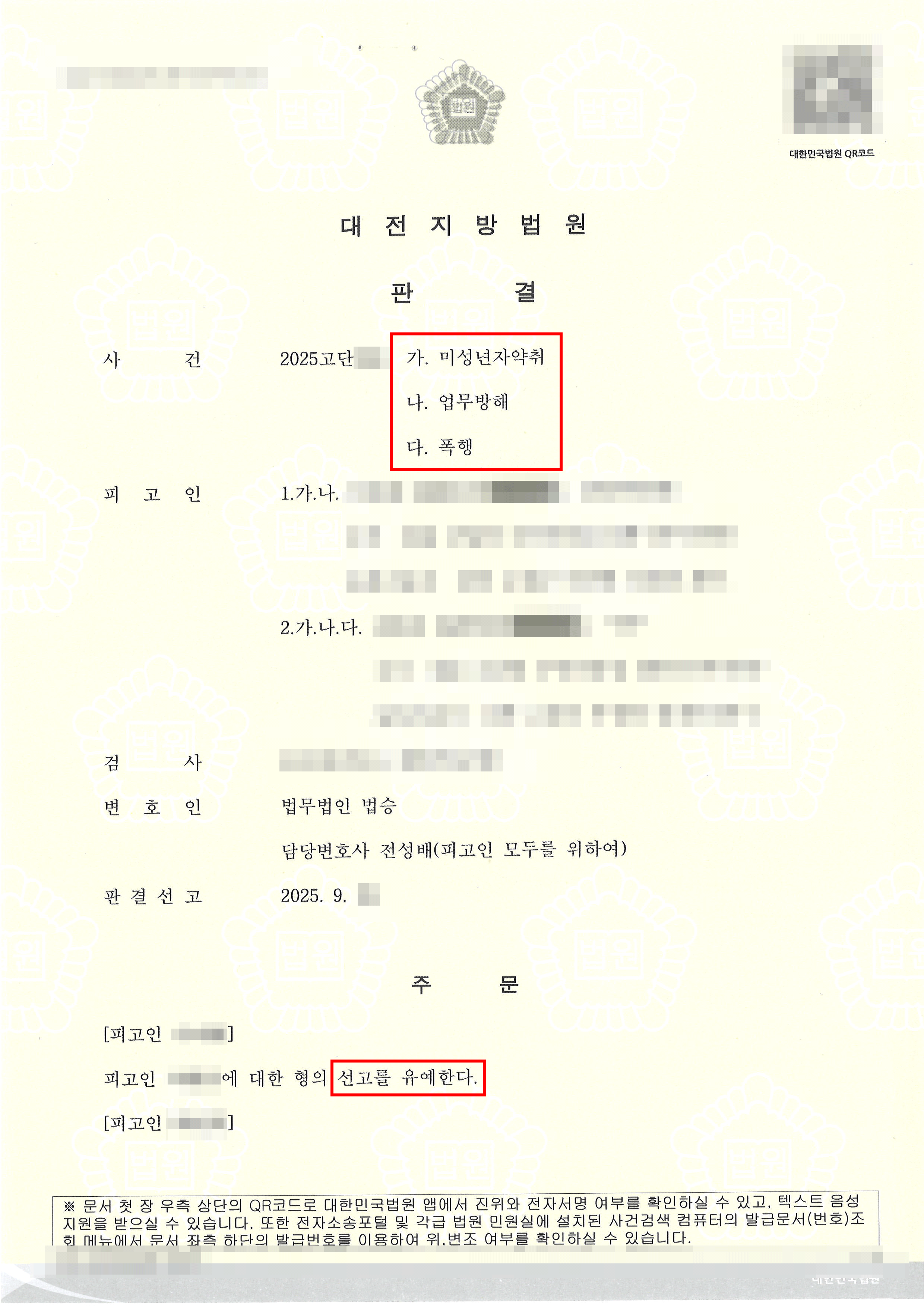 이로인해 의뢰인들은 미성년자 약취, 그리고 업무 방해, 폭행 죄로 기소되어 법무법인 법승 대전사무소를 방문하였습니다.