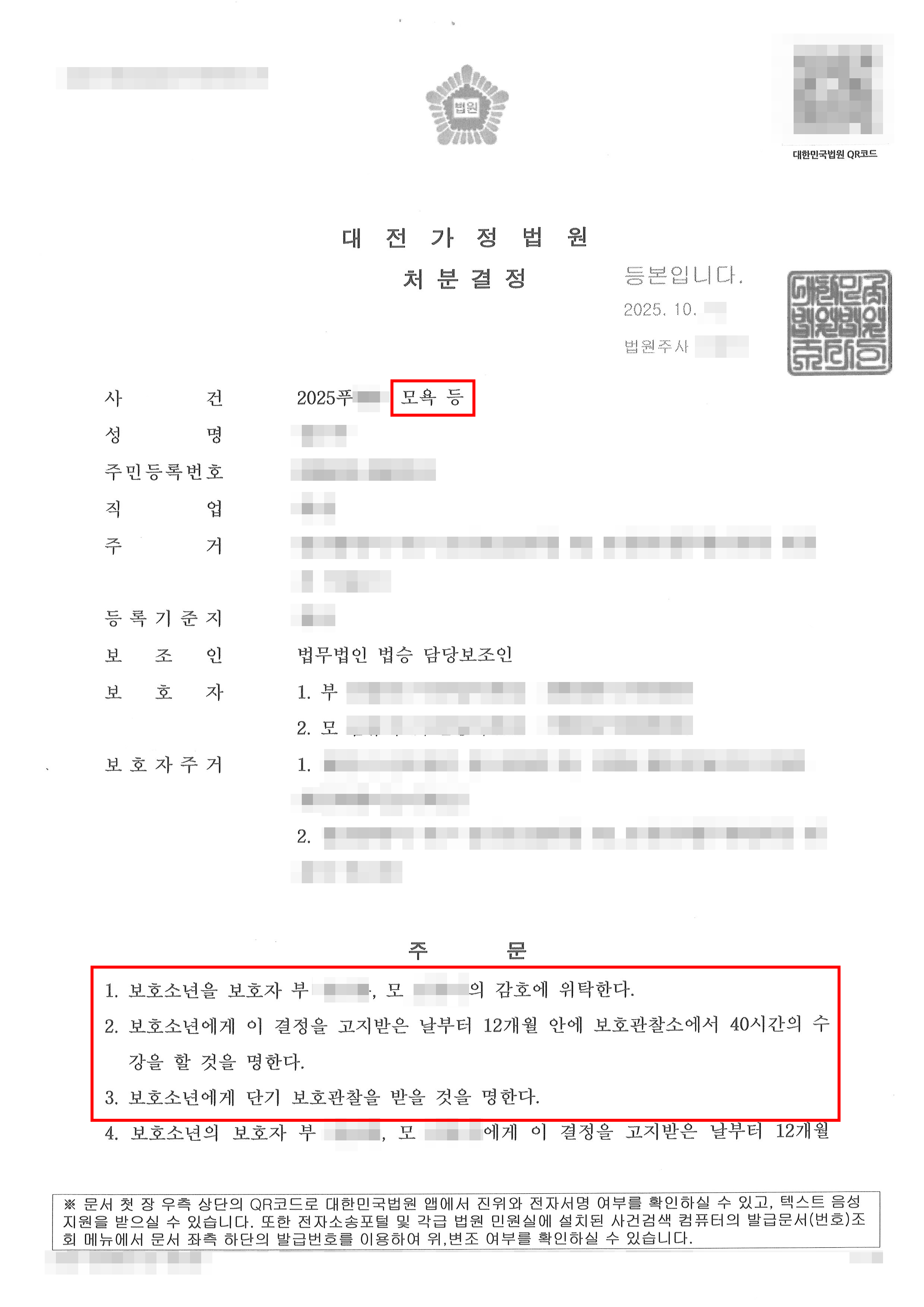 그 결과 검찰에서는 소년보호사건으로 송치하였고, 가정법원 판사님은 보호소년에게 보호자 감호 위탁(1호), 수강명령(2호) 및 단기 보호관찰(4호) 결정을 내려주셨습니다.