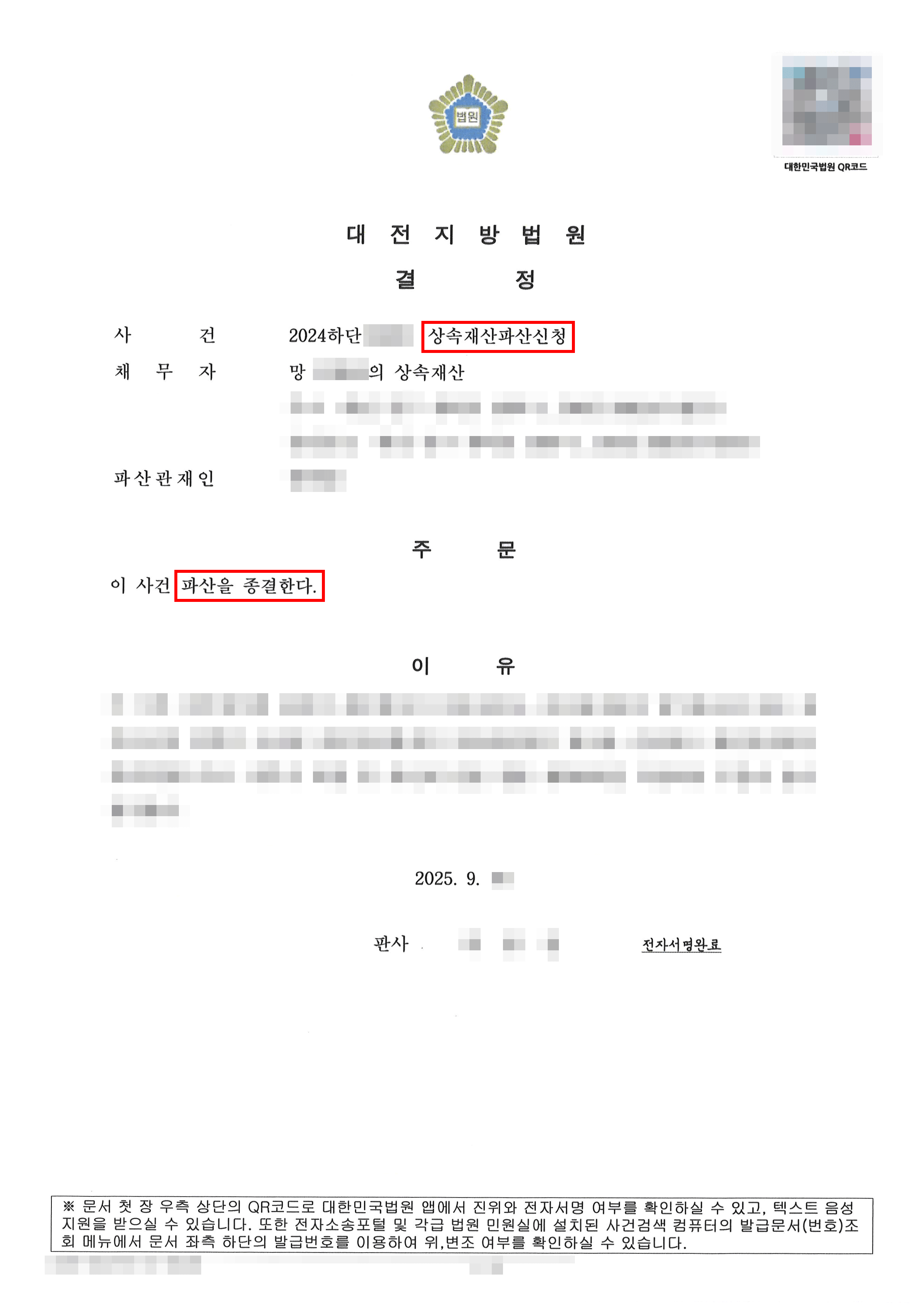 법원은 파산관재인을 선정하고 파산절차를 진행하며 배당절차와 채권자집회에서 파산관재인의 계산을 승인하며 채권자집회까지 모두 종결되어 상속재산 파산 종결 결정을 하였습니다.