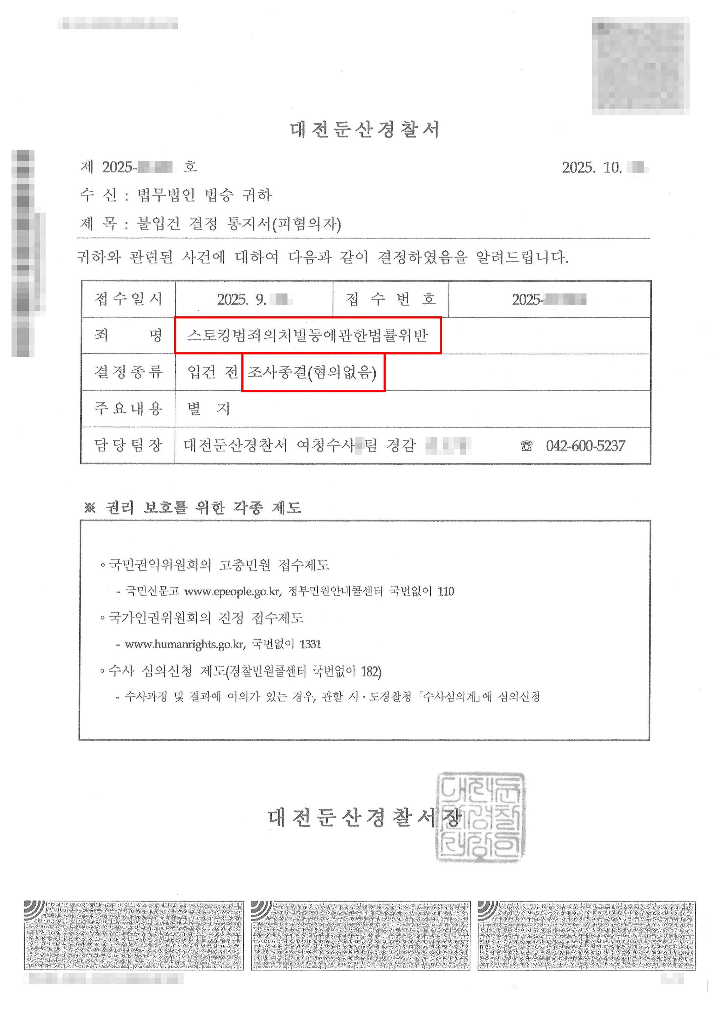 즉, 입건되지도 않았고, 송치되지도 않았으며, 전과·기록·잠정조치 모두 발생하지 않은, 스토킹 사건에서 가장 바람직한 결과입니다.