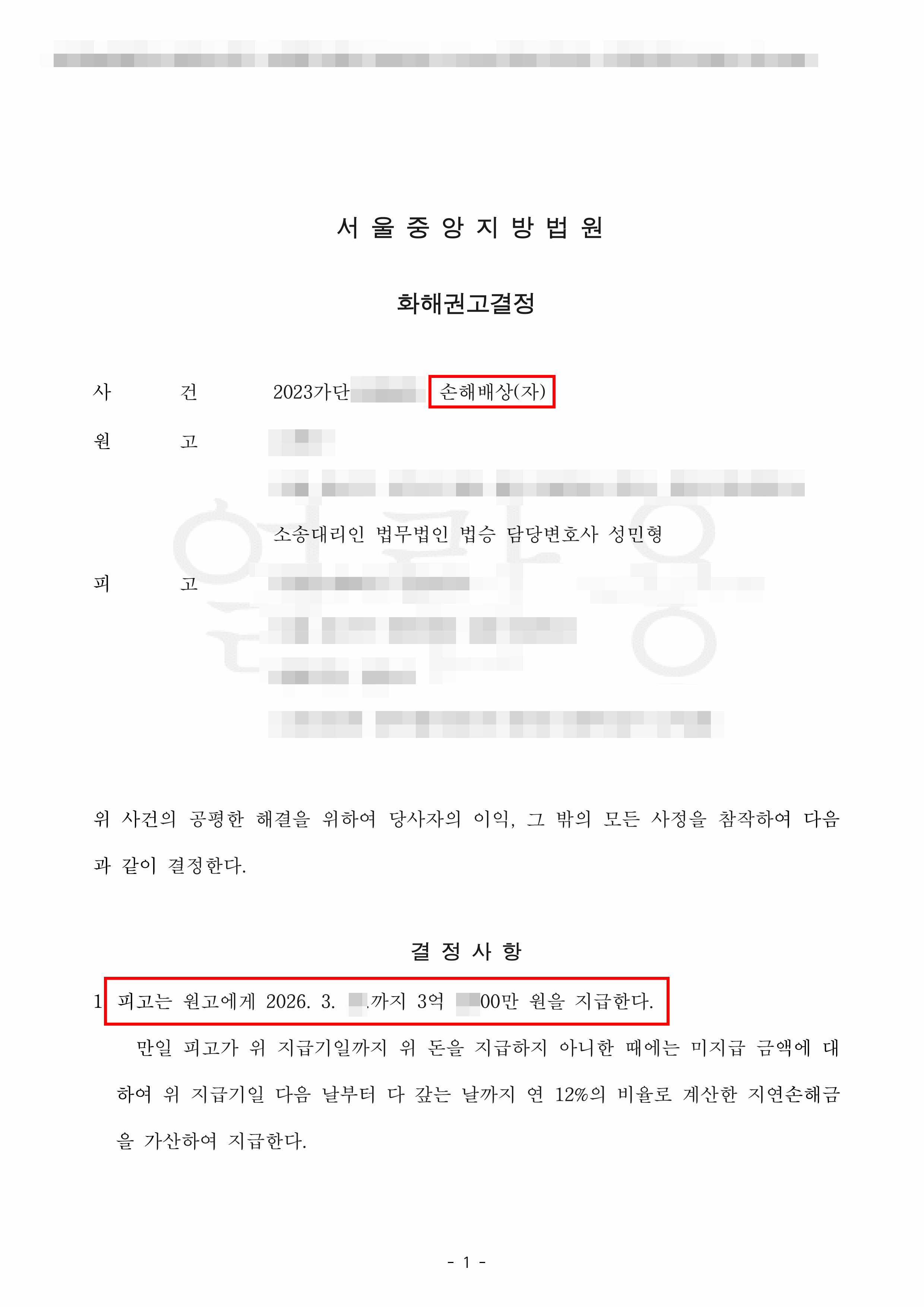 소송은 사고로부터 4년간 진행되었고, 법원은 보험사가 의뢰인에게 3억 6,500만 원의 손해배상금을 지급하라는 내용의 화해권고결정을 내렸습니다.