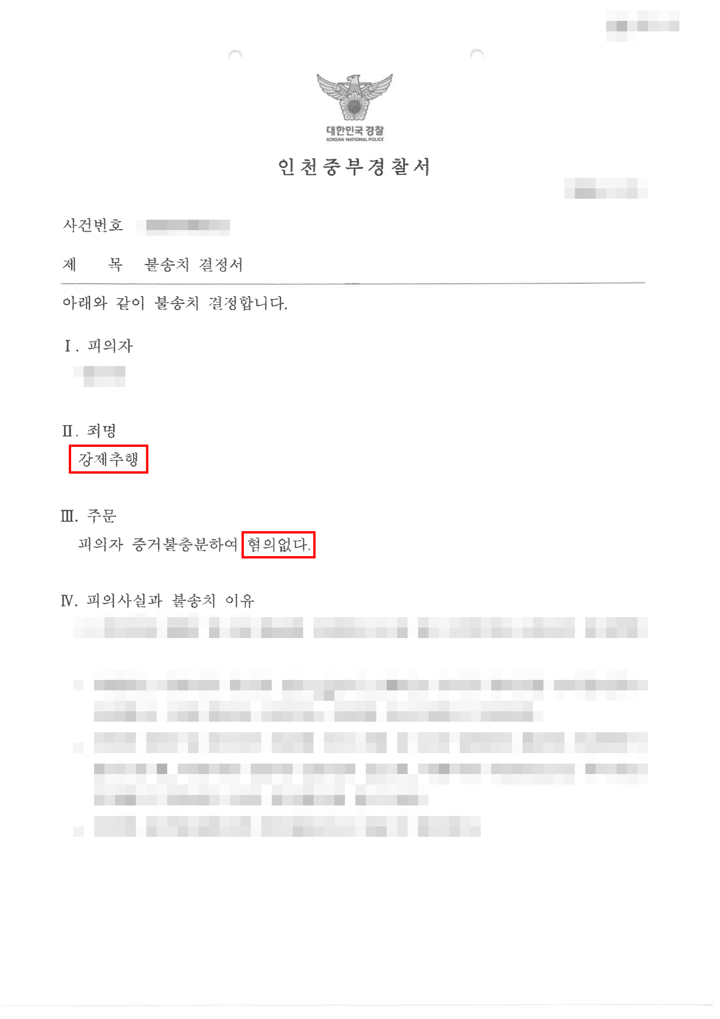 결국 인천중부경찰서는 의뢰인에 대하여 '증거불충분으로 혐의없음'을 이유로 불송치 결정을 내렸습니다.