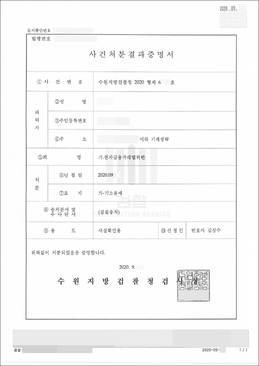 의뢰인에게 적용된 혐의는 전자금융거래법 위반으로 전자금융거래법 제6조 제3항에 의하면 대가를 수수, 요구 또는 약속하거나 범죄에 이용할 목적으로 또는 범죄에 이용될 것을 알면서 접근매체를 대여 받거나 대여하는 행위 또는 보관, 전달, 유통하는 행위를 금지하고, 동법 제49조 제4항에 따라 이를 위반할 시 3년 이하의 징역 또는 2천만 이하의 벌금에 처하도록 하고 있습니다.