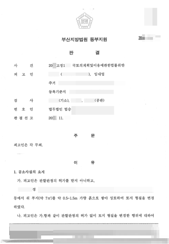 의뢰인은 건물을 하나 구입하였는데, 이전 건물주의 성토행위로 인하여 건물 방향으로 흙이 쏟아져 들어와 지하실을 제대로 사용할 수 없는 지경에 이르렀습니다. 이후 의뢰인은 이를 해결하기 위해 민원을 제기하였는데, 그럼에도 불구하고 문제는 제대로 해결되지 않았고 결국 의뢰인은 더 이상 토사가 흘러내리지 못하도록 직접 축대를 쌓았습니다. 이로 인해 토사는 더 이상 쏟아지지 않았는데, 이 축대 공사를 성토 행위 공사로 오인한 공무원이 의뢰인에 대한 진정을 제기하였고, 의뢰인은 억울하게 누명을 쓰게 되었습니다.