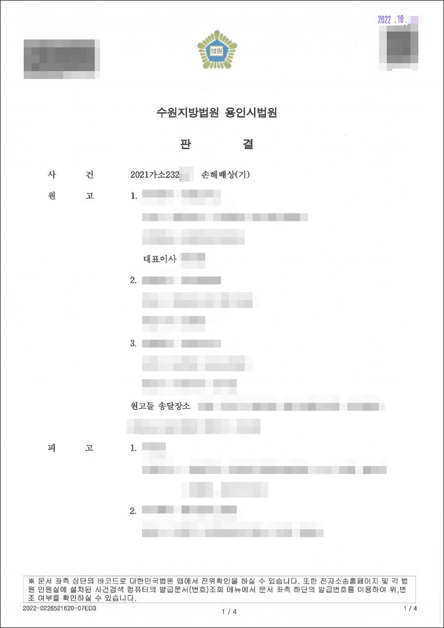원고 소송비용 전액 부담 | 손해배상(기) - 수원지방법원 용인시법원 20**가소232***