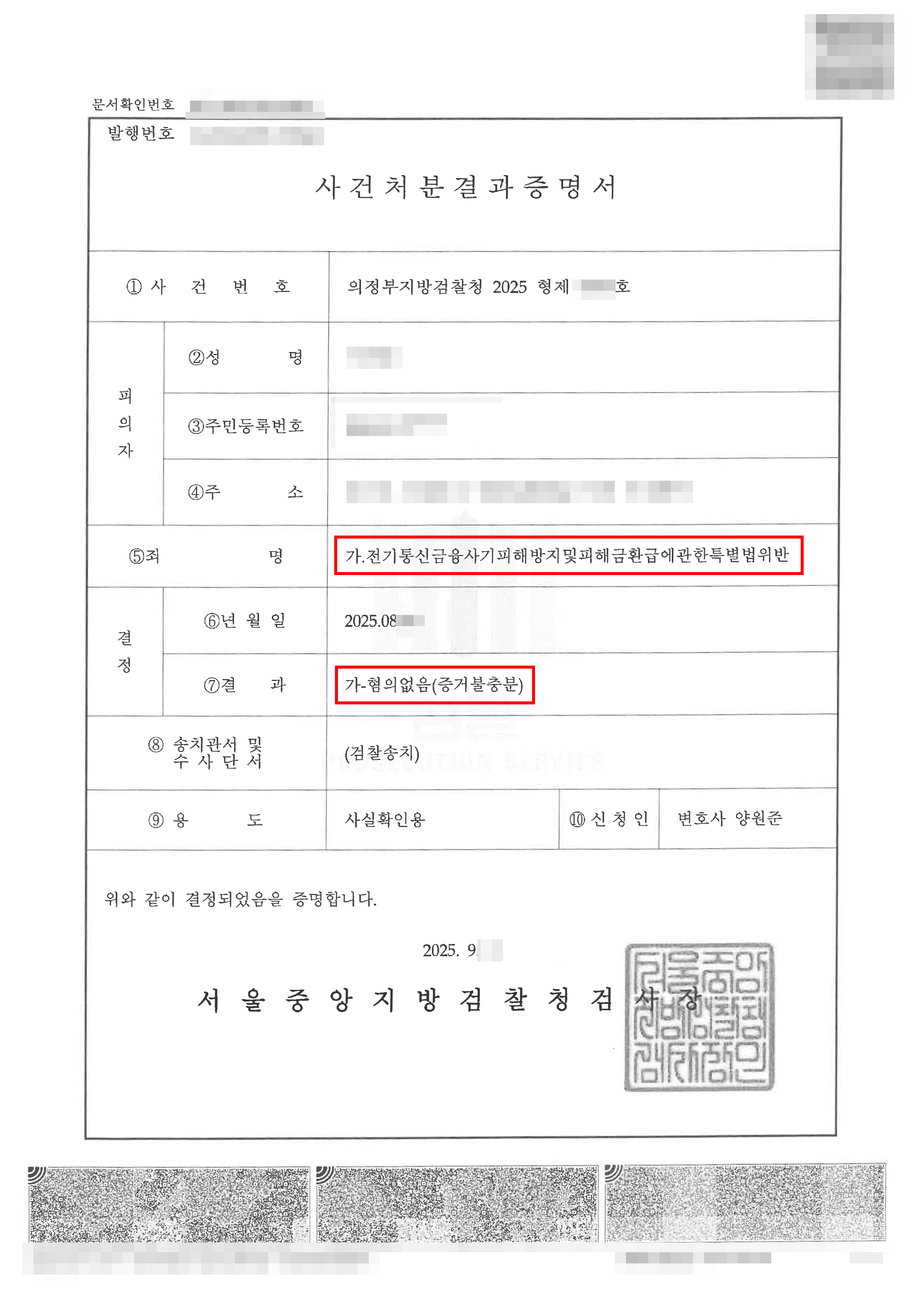 검찰은 법무법인 법승의 주장을 받아들여, 의뢰인이 보이스피싱 범행을 인식했다고 단정하기 어렵다고 판단, ‘혐의없음(증거불충분)’ 불기소 처분을 내렸습니다. 의뢰인은 억울한 누명을 벗고 범죄 전과자라는 낙인 없이 일상으로 돌아갈 수 있었습니다.
