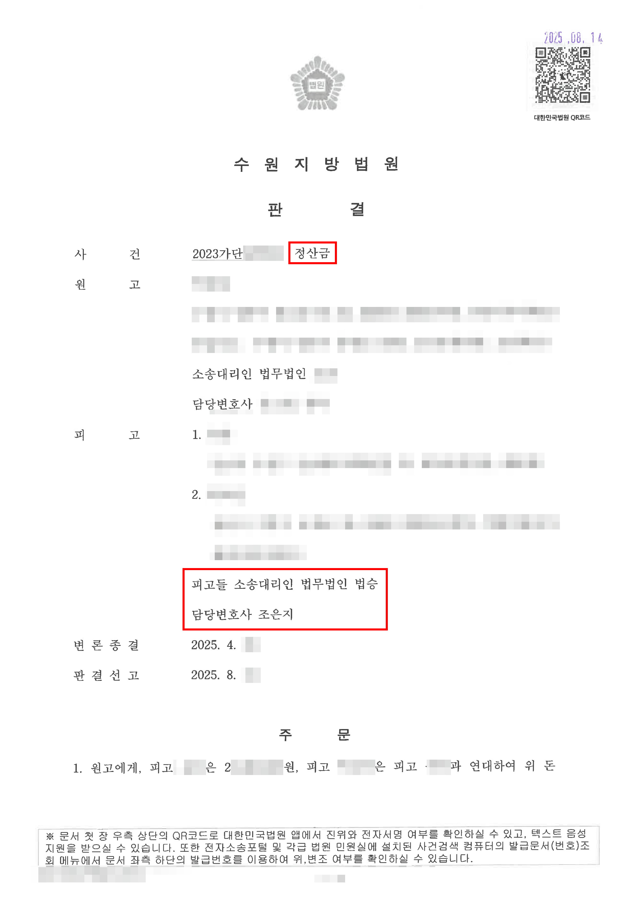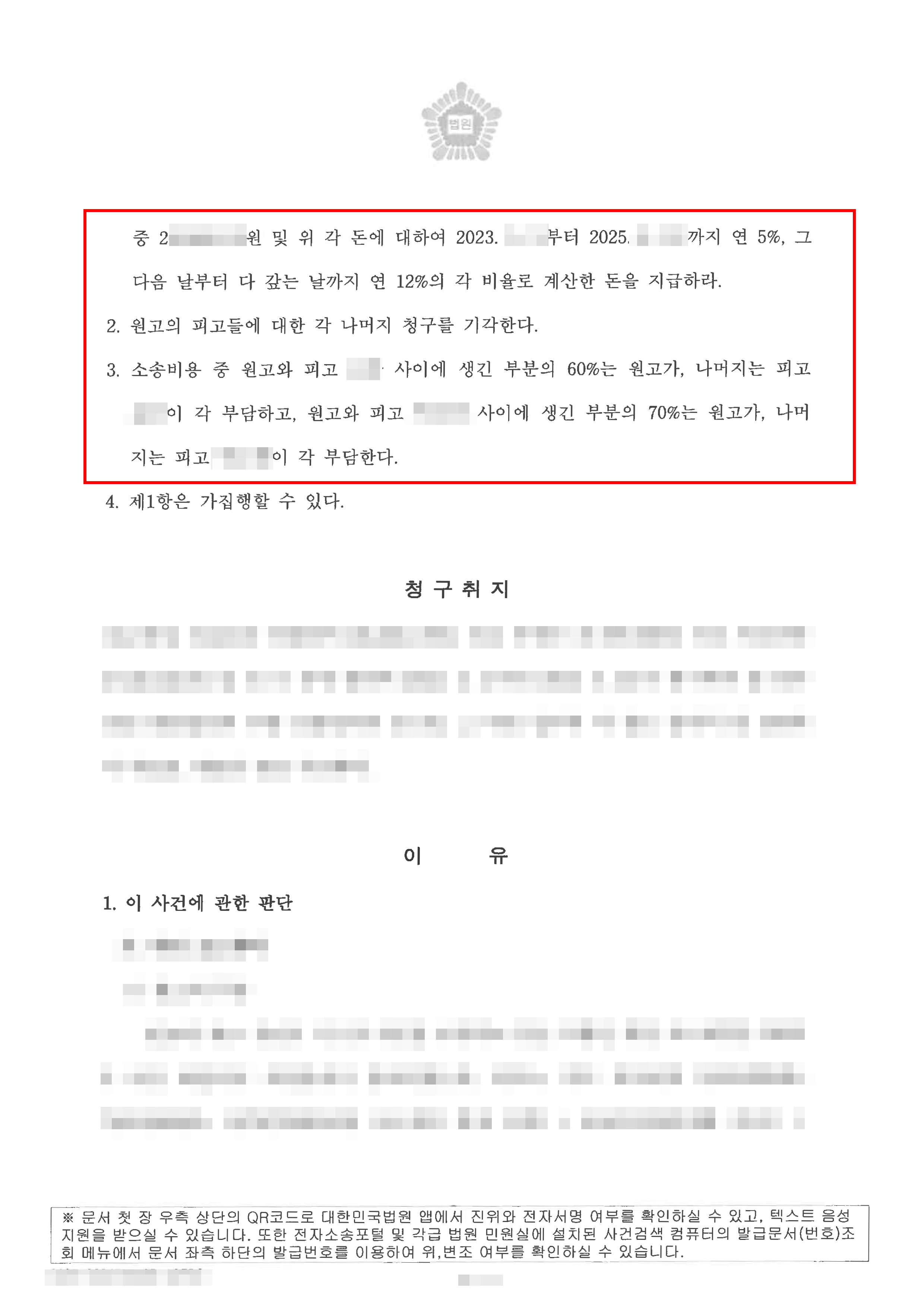 이 사건은 의뢰인들이 일부승소하여, 청구금액 1억 중 약 2천만원 만 정산금으로 지급하고, 소송비용 역시 대부분 상대방이 부담하라는 판결을 얻었습니다.