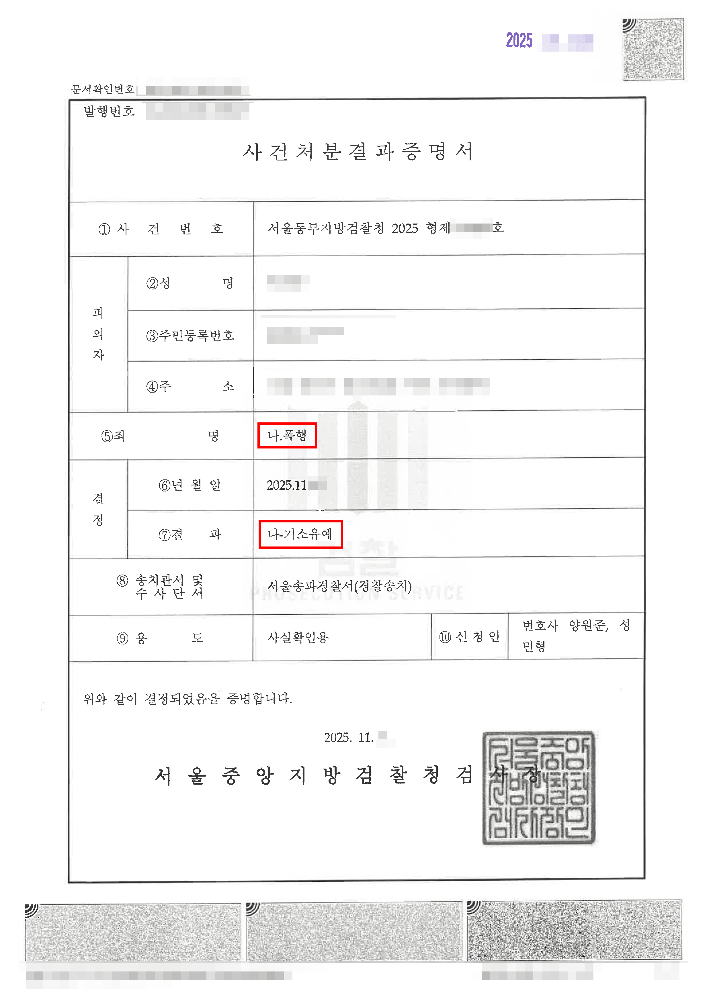 폭행사건에는 특히 정당하게 방어하려 했던 의도가 되려 불리하게 작용되고, 상대방과 동일한 가해자처럼 취급되는 억울한 상황에 놓일 위험이 매우 높습니다. 법무법인 법승은 사건 초기부터 사실관계를 정리하고 필요한 증거를 신속히 확보하여 의뢰인의 방어권이 온전히 보장될 수 있도록 전략적으로 대응하였고, 그 결과 의뢰인이 원하시는 결과를 얻게 된 사례라고 볼 수 있습니다.