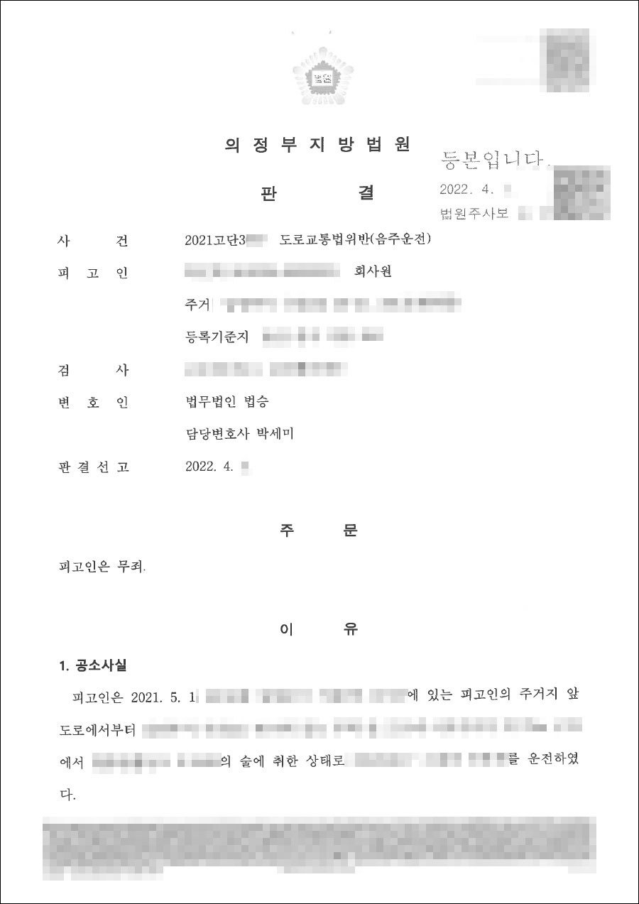 무죄 | 도로교통법위반(음주운전) - 의정부지방법원 2021고단*****호