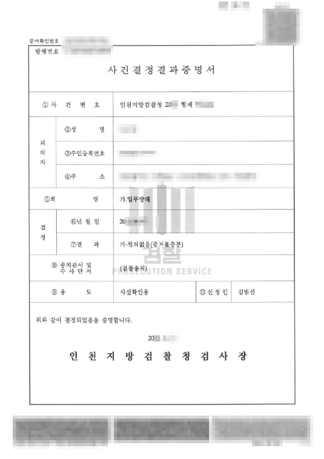 그 결과 인천지방검찰청 담당 검사는 의뢰인에게 혐의없음 처분을 내렸습니다.