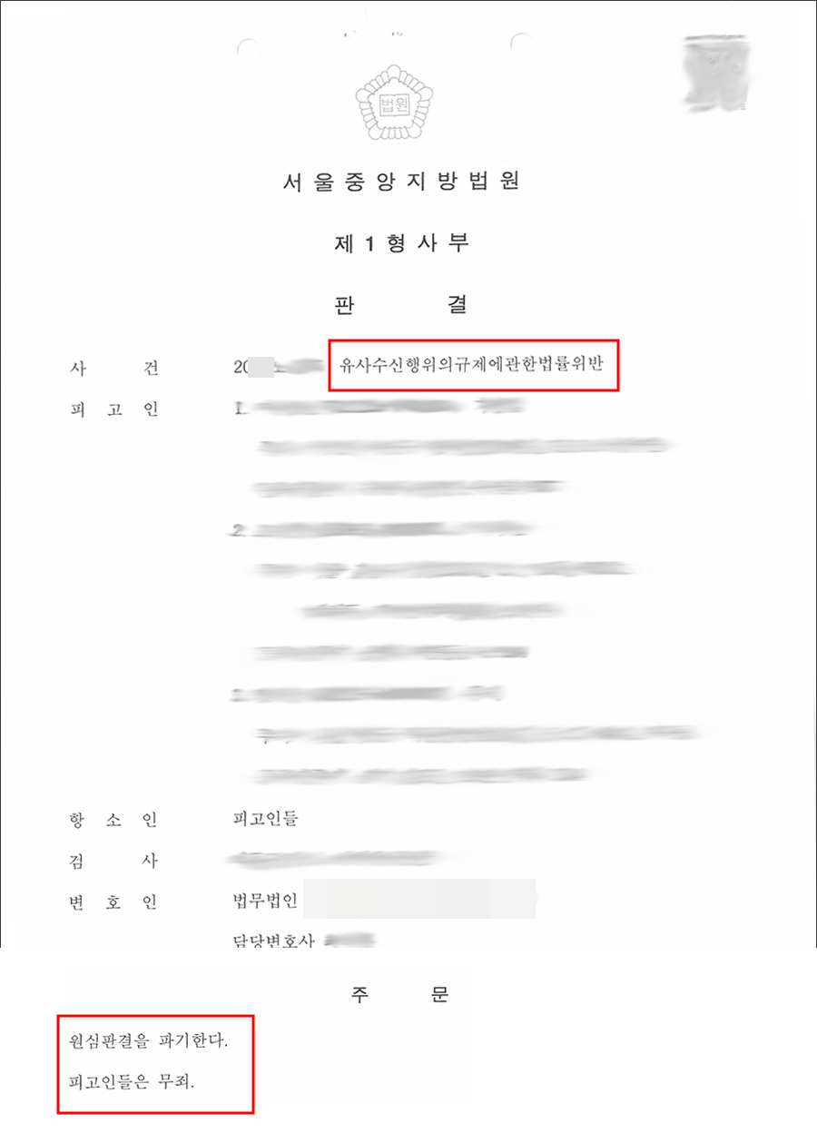 본 사건은 자칫하면 유죄로 끝날 수 있는 사건임에도 실체적 진실을 끝까지 밝혀 피고인들이 억울함이 없도록 하자는 본 법무법승의 업무 처리 방침의 하나로, 본 변호인이 피고인들인 의뢰인들을 설득하여 항소심을 진행하고, 그 과정에서 끝까지 포기하지 않고 실체적 진실을 파헤치기 위하여 법무법인 법승의 변호사들이 노력한 결과물이라 할 것입니다.