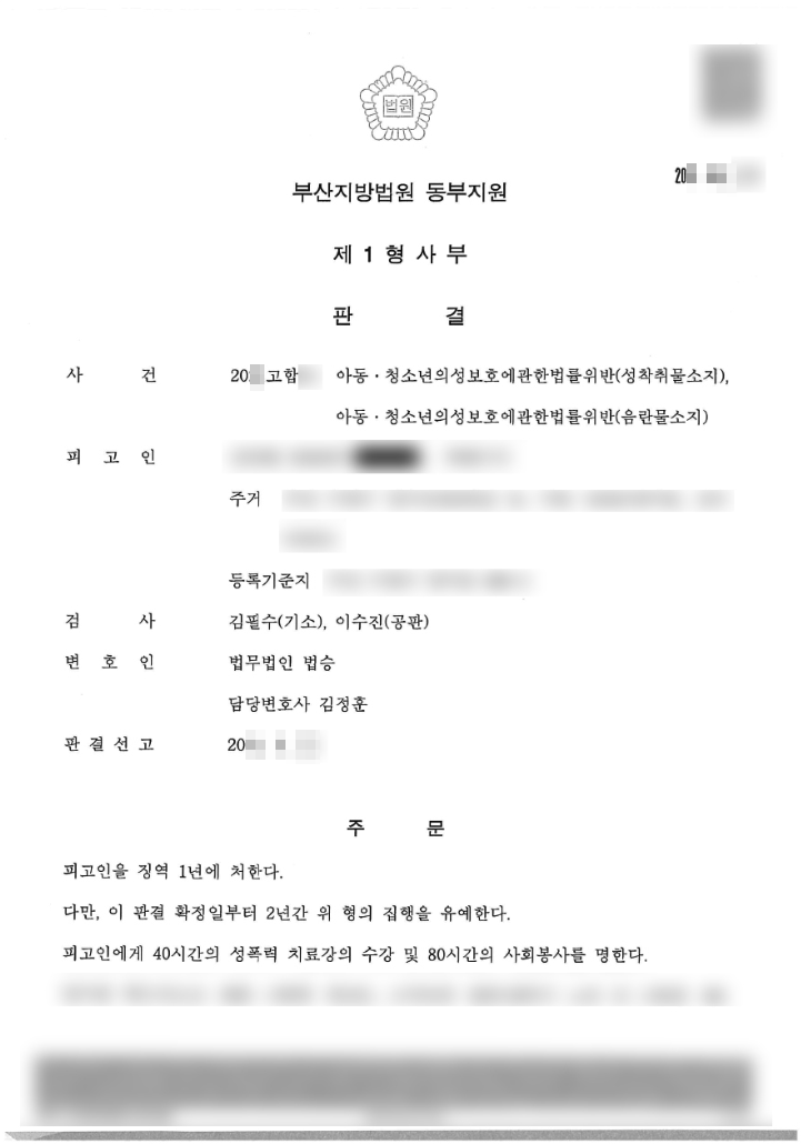 최근 성범죄, 특히 아동ㆍ청소년이 관련된 성범죄는 그 처벌이 매우 무거워졌으며 대부분의 경우 실형을 피하기 힘든 것이 현실입니다. 그러나 의뢰인은 법무법인 법승 부산 사무소 변호인들과 함께 착실히 재판을 준비하여 법정 구속을 면하고 집행유예 판결이라는 큰 성공을 거둘 수 있었습니다.
