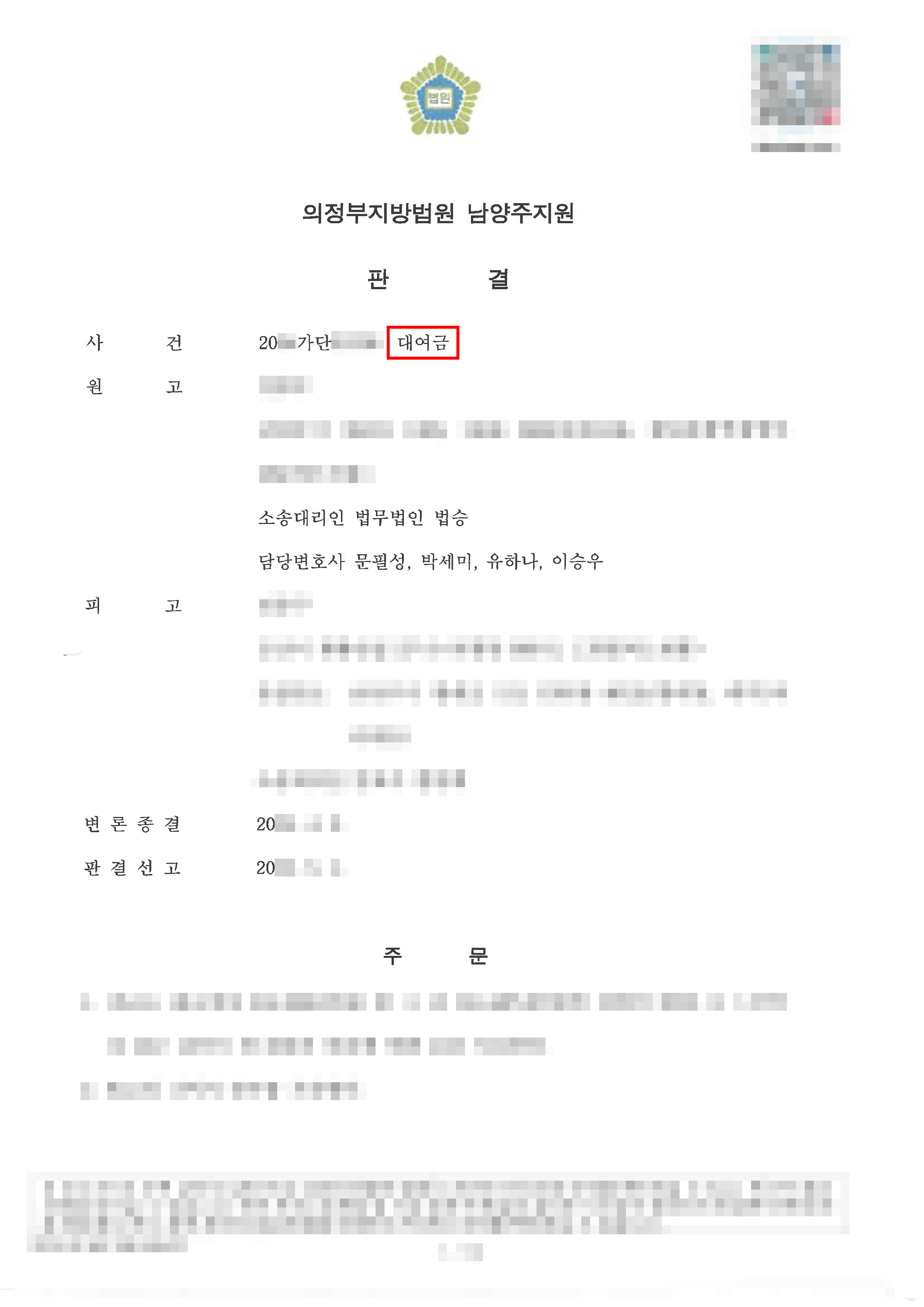 남양주민사전문변호사의 결과 | 법원은 당사자가 ‘원금보장성격의 대여금 약정’을 체결한 것을 인정하였고, 설령 계약서상 모호한 부분이 있다 하더라도 상대방이 사후 구두로 반환약정을 했기 때문에 원금반환의무가 있다는 의뢰인측 주장을 모두 인정하여, 의뢰인의 청구를 전부 인용했습니다.