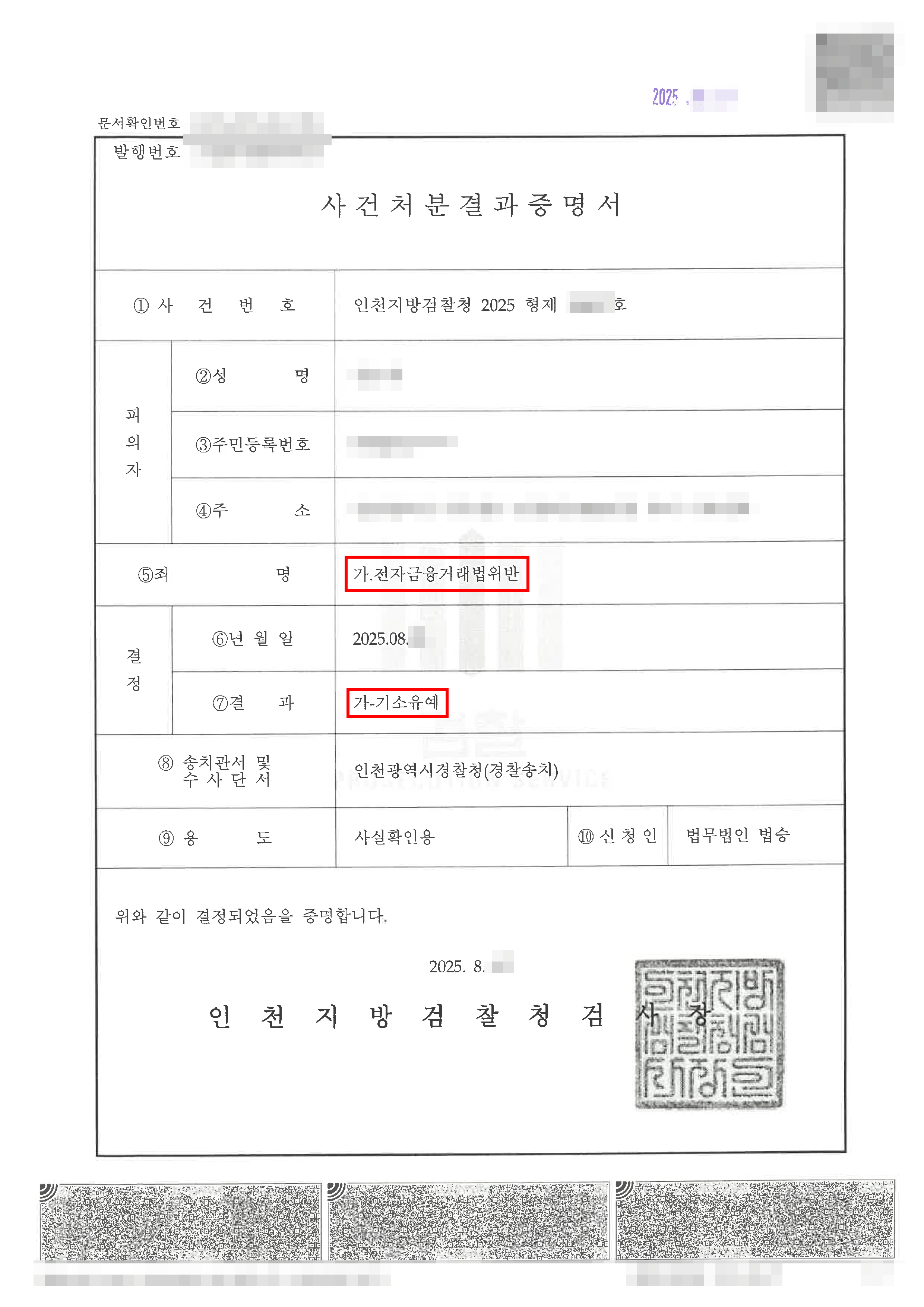 인천지방검찰청은 2025년 8월 22일 의뢰인에 대해 기소유예 처분을 내렸습니다. 검찰은 불기소이유서에서 "피의자가 불상자로부터 거래실적을 만들어 대출을 받을 수 있음을 고지받고 토스뱅크 인증정보를 알려주어 불상자가 다른 휴대폰 기기로 피의자의 토스뱅크에 접속한 사실을 인식한 사안으로 접근매체 양도의 점은 충분히 인정되나, 피의자가 이 사건으로 실제 대출을 받거나 이득을 취득한 바는 없는 점, 미필적으로 고의로 범행한 점, 피의자가 재범하지 않을 것을 다짐하고 있는 점 등 제반사정을 참작하였다"고 밝혔습니다.
