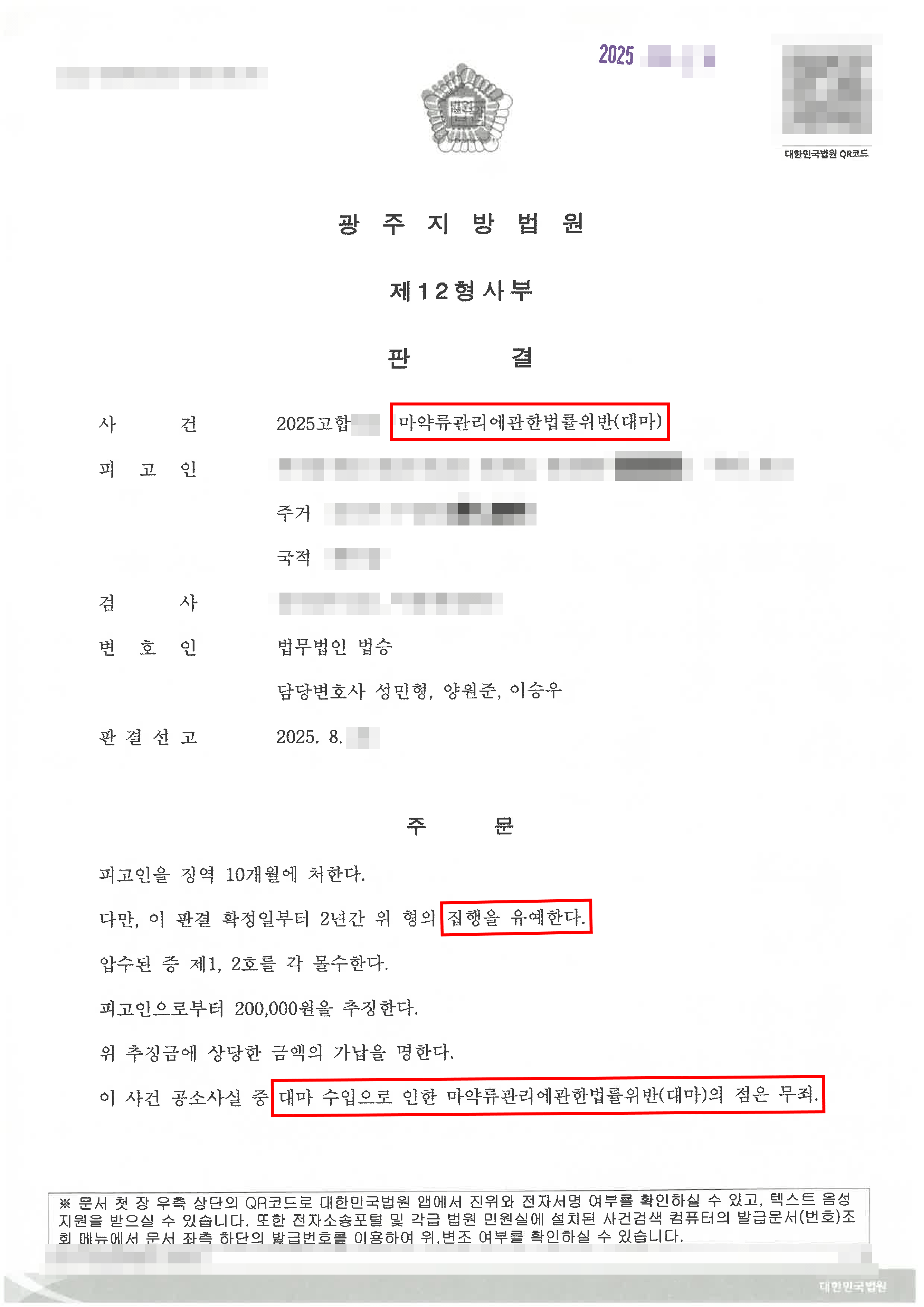 법무법인 법승은 이미 대마 수입 혐의로 이미 유죄 판결을 받은 공범에 대한 증인신문과 피고인신문을 통해 의뢰인이 대마 수입을 적극적으로 공모하거나 특별한 실행행위를 한 사실이 없음을 입증하고자 하였습니다.