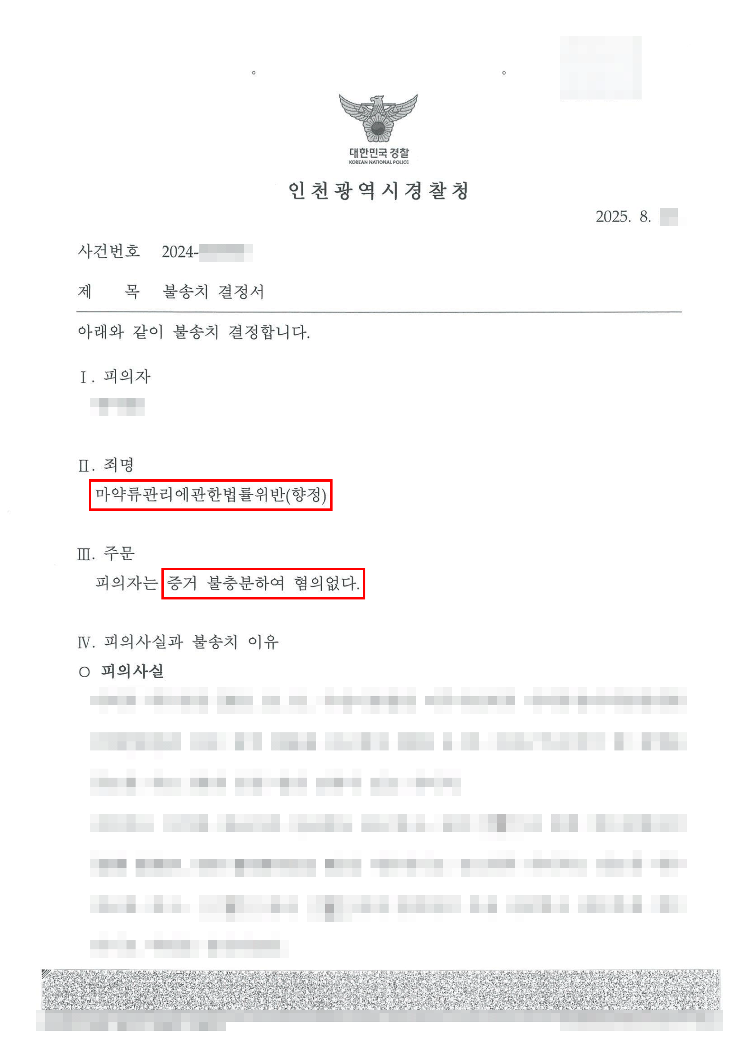인천경찰청은 2025년 8월 25일 의뢰인에 대해 '증거 불충분하여 혐의없음'으로 불송치 결정을 내렸습니다.