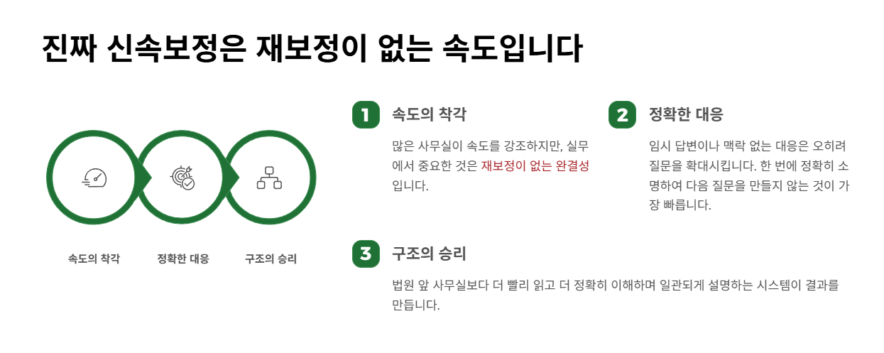제출 기한을 지키는 것은 기본이지만, 무조건 빨리 낸다고 유리한 것은 아닙니다. 내용이 부실한 채로 빨리만 제출하면 법원은 '재보정'을 명령하게 되고, 결국 전체 심사 기간은 더 늘어납니다. 진정한 의미의 신속보정은 '단 한 번의 제출로 법원의 궁금증을 완전히 해소하는 것'입니다.