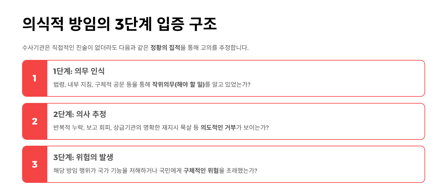 상급자의 지시는 의무 인식을 강화하는 강력한 증거가 되지만 무조건적인 것은 아닙니다. 실무자가 해당 지시의 위법성을 우려했거나, 물리적으로 이행이 불가능했던 사정, 혹은 다른 긴급한 직무 수행을 위해 우선순위를 조정한 사정 등이 입증된다면 의식적 방임이라는 고의는 조각될 수 있습니다. 단순히 안 한 것과 이유가 있어 못한 것을 구별하는 것이 핵심입니다.