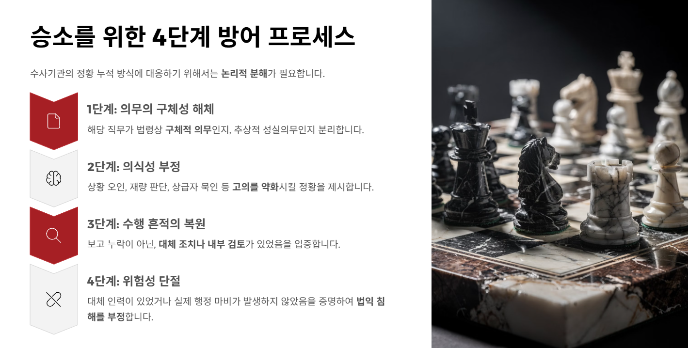 직무유기 사건에서 방어는 네 단계로 이루어져야 합니다.