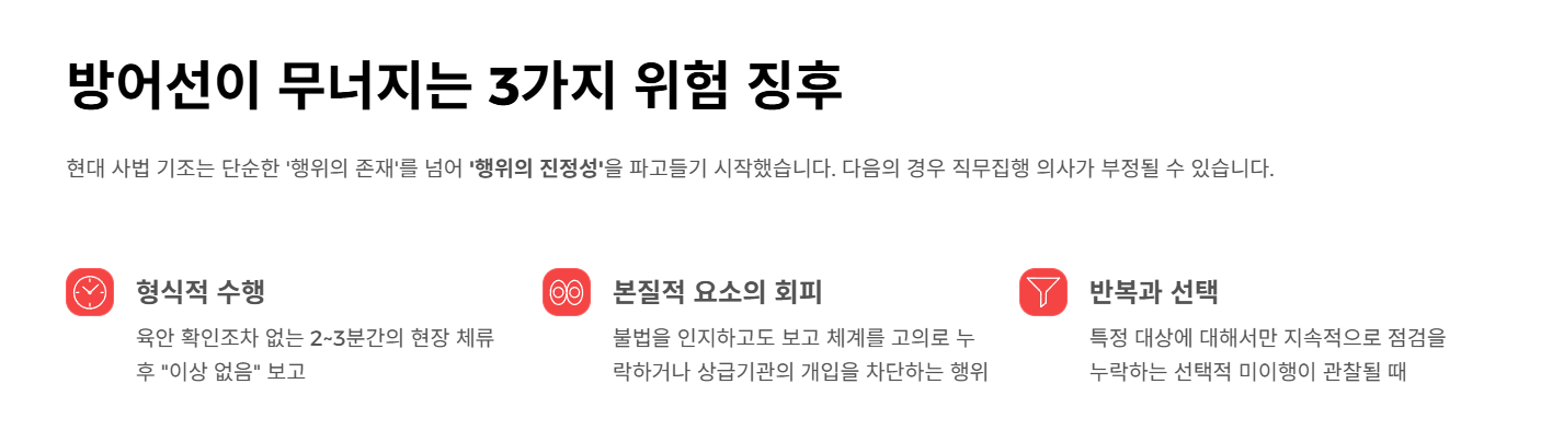 현장에 나가 점검을 하려는 시도와 행위가 있었다면 원칙적으로 직무유기에는 해당하지 않습니다. 다만 그 점검이 육안 확인조차 생략한 채 서류만 작성한 수준이거나 고의로 특정 위험 요소를 눈감아준 정황이 있다면, 법원은 이를 형식적인 수행에 불과한 직무 포기로 간주할 수 있습니다. 부실의 정도가 직무의 본질적 기능을 완전히 상실시킨 수준인지가 관건입니다.