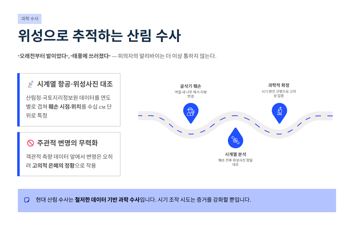 객관적인 항측 데이터 앞에서는 피의자의 주관적인 변명이 통용되지 않으며, 오히려 범행을 적극적으로 은폐하려 한다는 불리한 정황(고의성)으로 작용할 뿐입니다.