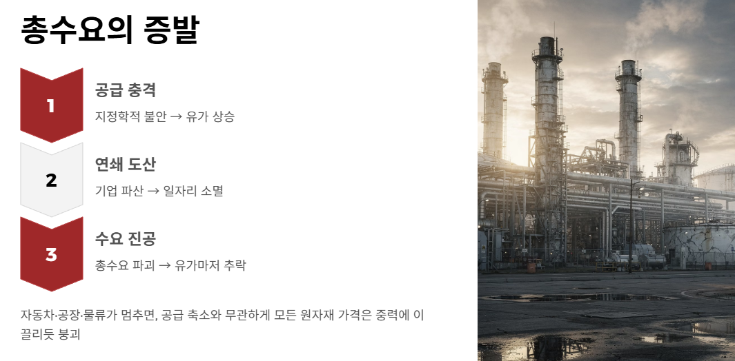 하지만 신용의 블랙홀이 기업의 연쇄 도산을 부르고 사람들의 일자리를 빼앗아 가면, 경제 전체의 구매력을 의미하는 '총수요(Aggregate Demand)' 자체가 완전히 파괴(Demand Destruction)됩니다. 자동차가 멈추고, 공장의 기계가 가동을 멈추며, 물류가 얼어붙습니다.