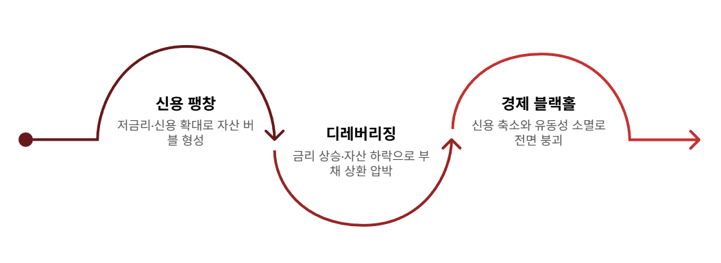 팽창하던 신용이 회전을 멈추고 반대 방향으로 역회전하는 디레버리징(Deleveraging)이 시작되면, 경제는 거대한 블랙홀(Black Hole)로 돌변합니다. 시장에 존재하던 유동성과 가치들을 말 그대로 '소멸(Extinction)'시키며 무한히 수축(Contraction)하는 것입니다.