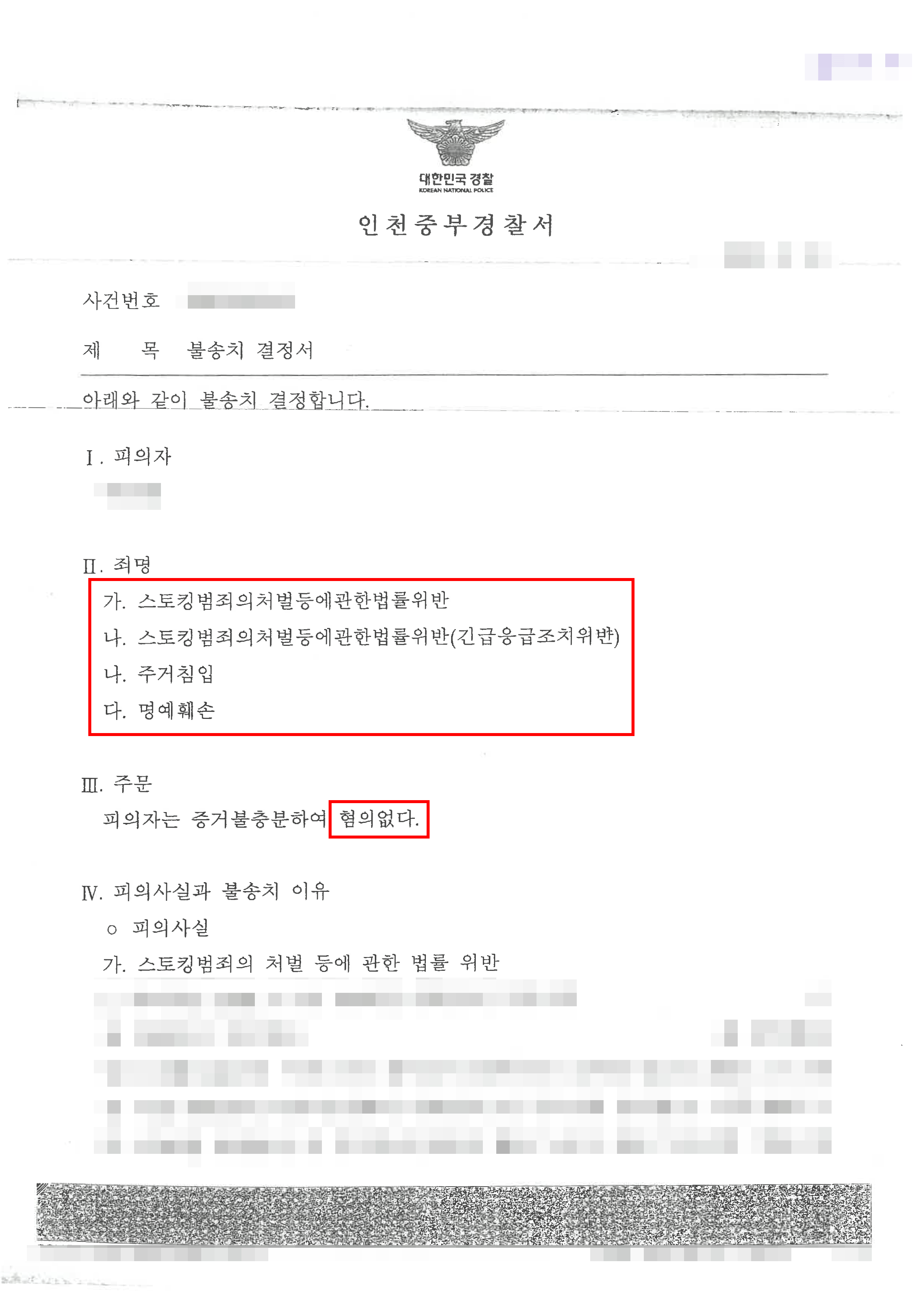 이에 인천중부경찰서는 변호인의 주장을 모두 받아들여 의뢰인에게 제기된 스토킹처벌법 위반, 주거침입, 명예훼손 등 모든 혐의에 대하여 증거불충분을 이유로 혐의없음 불송치 결정을 내렸습니다. 본 사건은 연인 관계가 파탄에 이른 후 감정적인 대립으로 인해 형사 고소까지 이어진 복합적인 사건이었습니다.