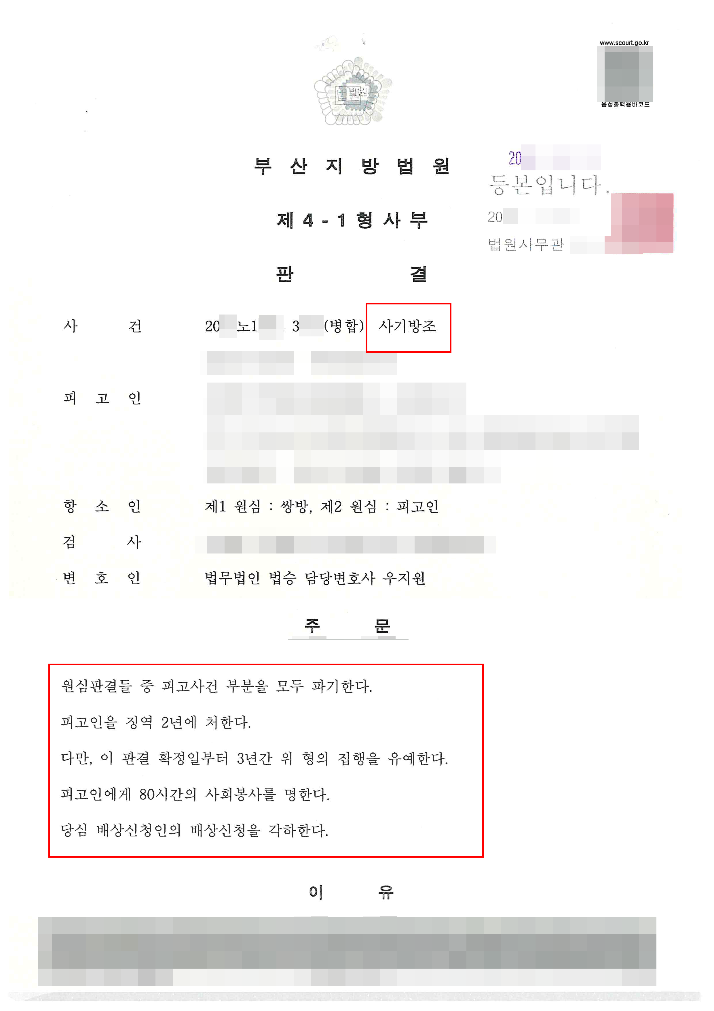 집행유예 | 사기방조 - 부산지방법원 동부지원 20**노1***,3***