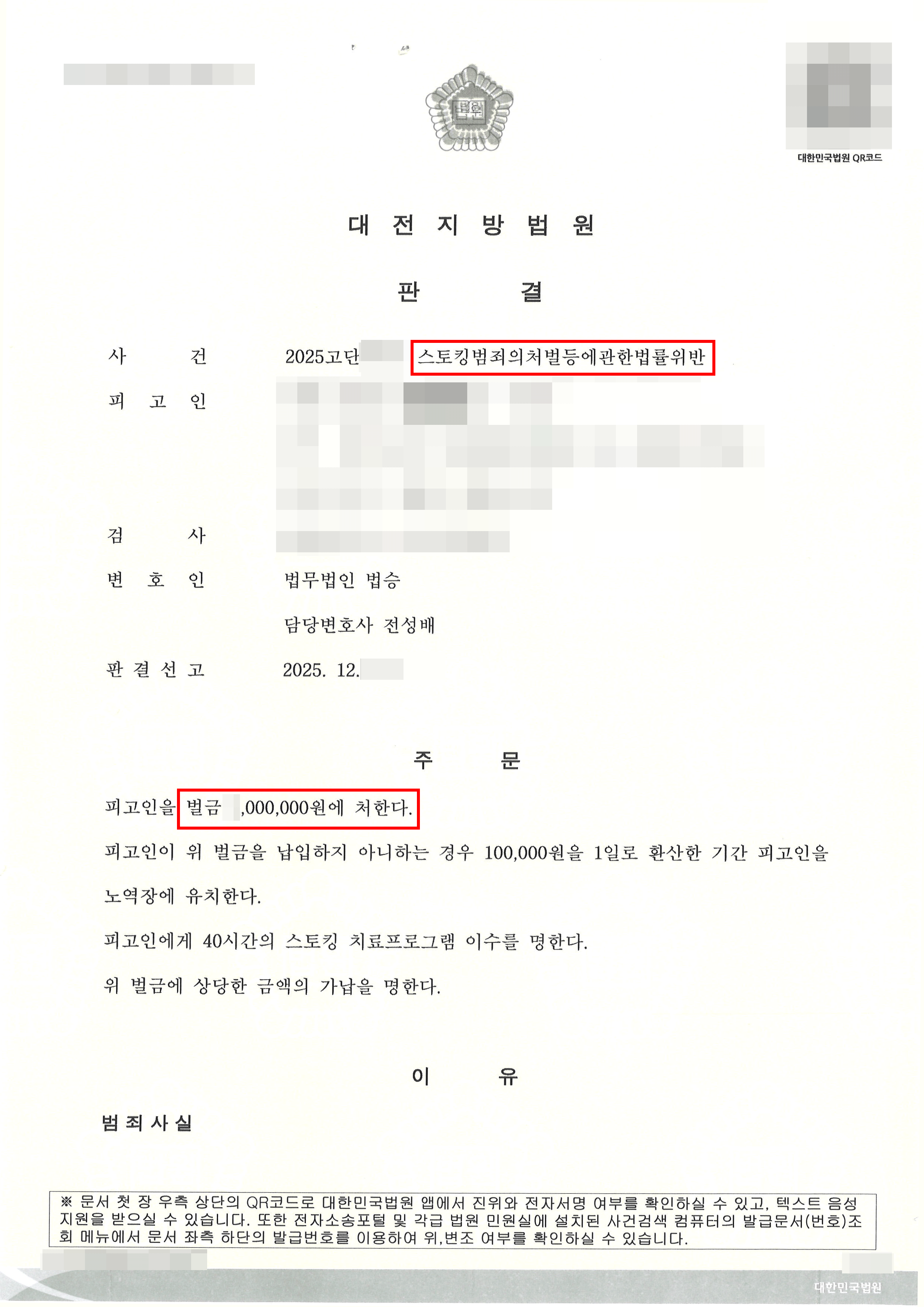 법원은 의뢰인의 행위가 스토킹에 해당함은 인정하면서도, 범행의 경위와 내용 등을 종합적으로 고려하여 벌금형을 선고하였습니다.