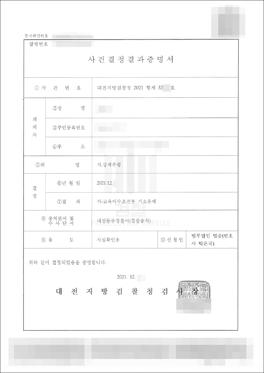 그 결과 검찰은 의뢰인의 강제추행 혐의에 대해 교육이수 조건부 기소유예를 결정, 불기소처분으로 마무리할 수 있었습니다.