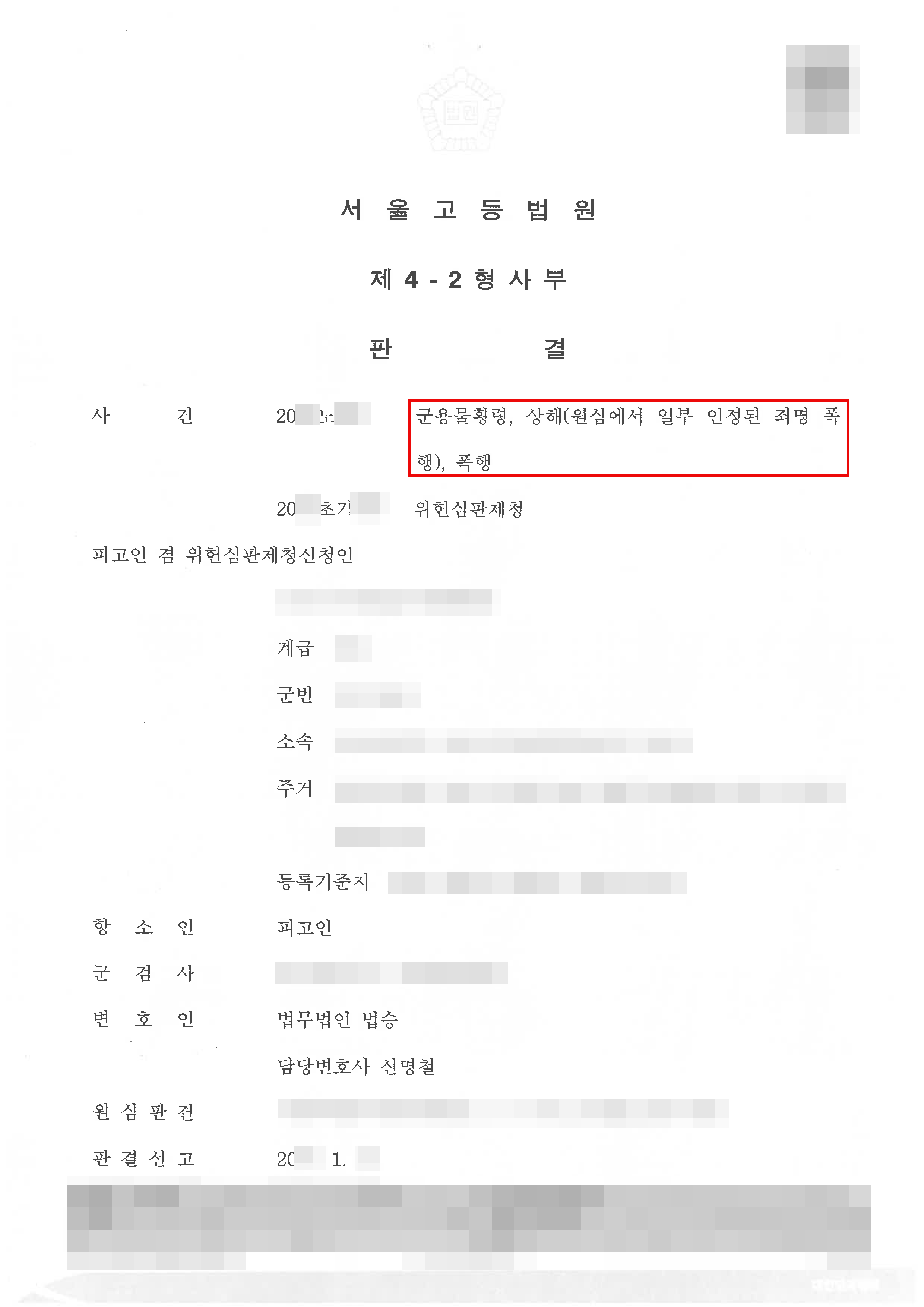 본 사건을 접한 법무법인 법승 형사·의료 전문 변호사인 신명철 변호사는 의뢰인을 고소한 고소인의 진술과 군사법원이 유죄 판결의 근거로 인용한 병원 진단서 기재 내용, 수사기록을 샅샅히 살핀 결과, 상대방이 진술에 허위가 많고, 진단서 내용 역시 이러한 상대방의 허위 진술에 따라 작성된 것으로 판단되었습니다.