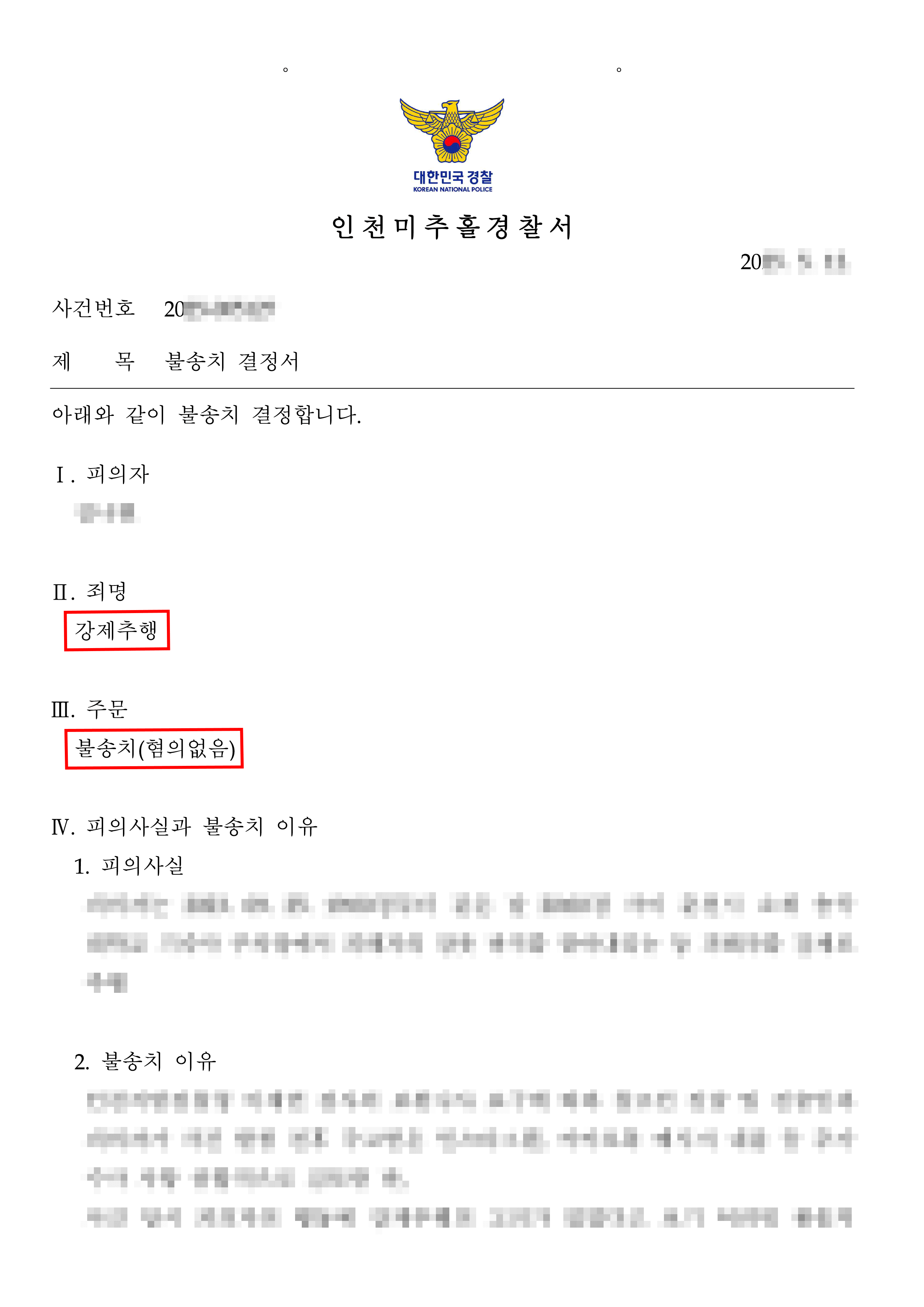 의뢰인은 인천미추홀경찰서로부터 불송치(혐의없음) 결정을 얻을 수 있었습니다.