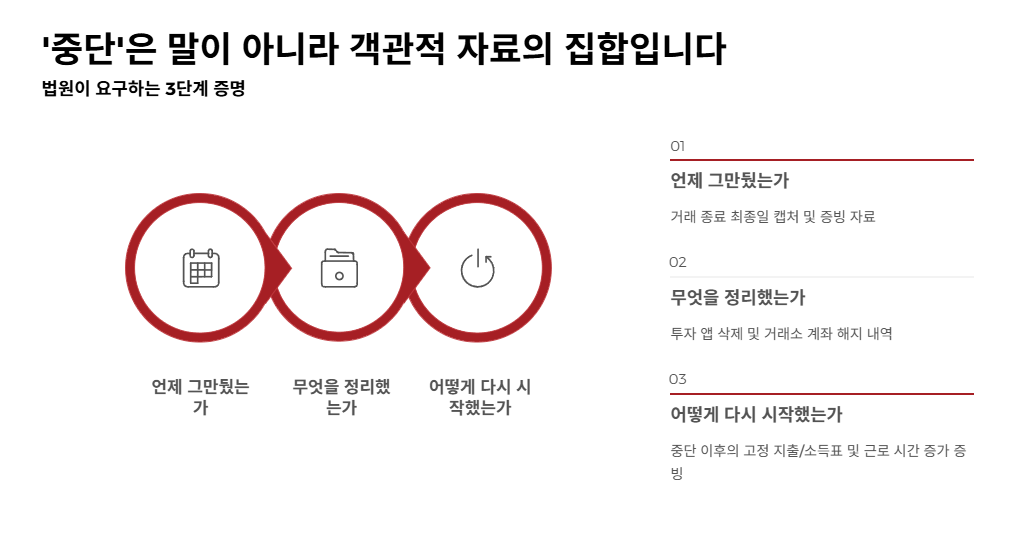앱 삭제는 시작일 뿐 충분한 증거는 아닙니다. 법원은 더 확실한 자료를 원합니다. 거래소 계좌의 폐쇄 확인서나 탈퇴 증명서, 그리고 무엇보다 중단 시점 이후부터 현재까지 통장 내역에 '투자 관련 입출금'이 단 1원도 없음을 보여주는 것이 가장 강력한 증거가 됩니다.