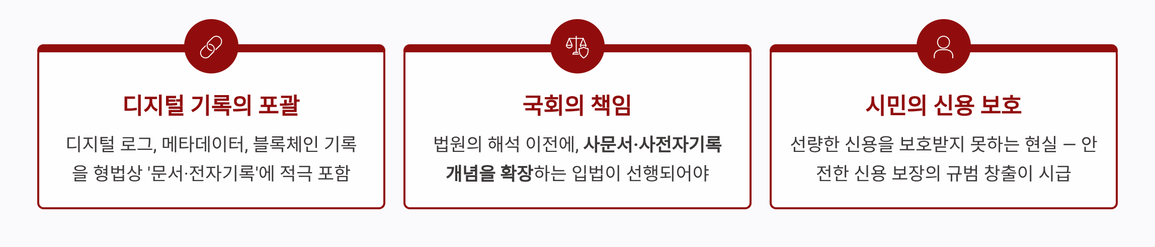 디지털 로그, 메타데이터, 블록체인 기록 등은 고전적 의미의 문서가 아님에도 불구하고 훨씬 강력한 사실증명력을 가집니다. 이를 형법상 '문서' 또는 '전자기록'의 범주에 적극적으로 포괄하여, 기술적 조작이 곧 사회적 범죄로 처벌받는 구조를 만들어야 합니다.