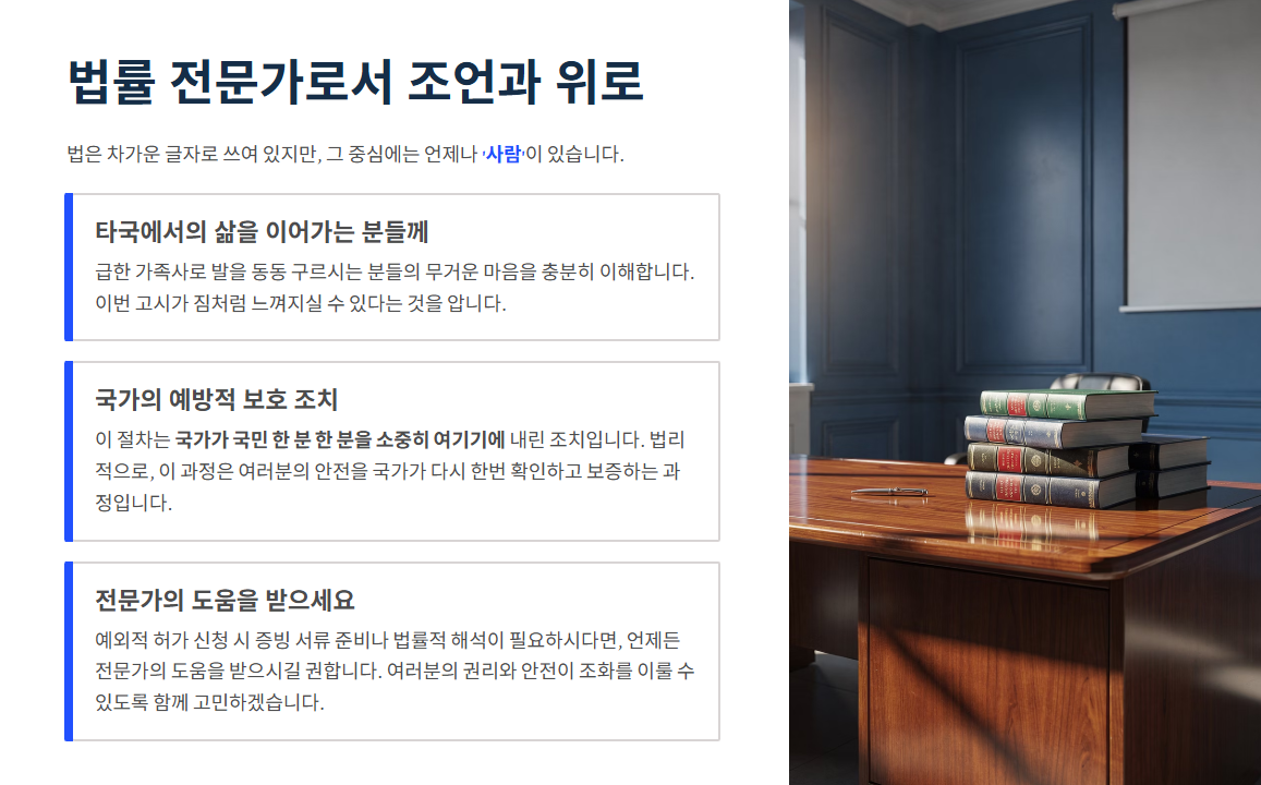 변호사로서 제가 드리고 싶은 말씀은, 법은 차가운 글자로 쓰여 있지만 그 중심에는 언제나 '사람'이 있다는 사실입니다. 타국에서의 삶을 이어가야 하거나 급한 가족사로 발을 동동 구르시는 분들에게, 이번 고시가 무거운 짐처럼 느껴지실 수도 있음을 충분히 이해합니다.