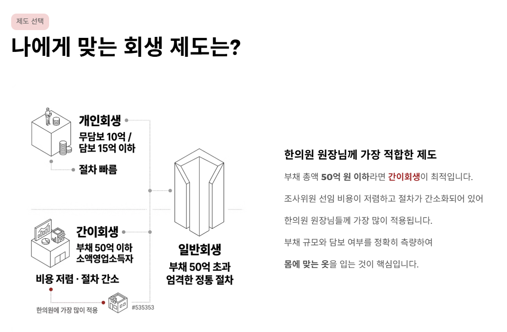 간이회생(Simplified Rehabilitation): 부채 총액이 50억 원 이하인 소액영업소득자(Small Business Debtor)를 위한 제도로, 조사위원 선임 비용이 저렴하고 절차가 간소화되어 한의원 원장님들께 가장 많이 적용됩니다.
