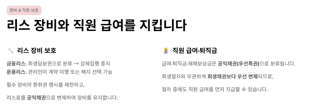 법리적 검토: 리스 채권은 그 성격에 따라 취급이 다릅니다. 금융리스의 경우 회생담보권으로 분류되어 강제집행이 중지되며, 운용리스의 경우 쌍무계약에 준하여 원장님(관리인)이 계약의 해지 또는 이행을 선택할 수 있습니다. 핵심은 병원 운영에 필수적인 장비에 대한 환취권(Right of Retrieval, 제3자가 채무자의 재산 중에서 자신의 재산을 반환해 달라고 청구할 수 있는 권리) 행사를 제한하고, 리스료를 공익채권(Administrative Claim)으로 분류하여 변제함으로써 장비를 지켜내는 것입니다.