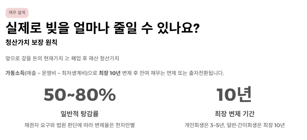법리적 검토: 회생계획안의 대원칙은 청산가치 보장의 원칙(Principle of Best Interests of Creditors)입니다. 즉, 앞으로 10년(개인회생은 3~5년) 동안 갚을 돈의 현재가치가, 당장 한의원을 폐업하고 재산을 다 팔았을 때 채권자들이 나눠 가질 수 있는 돈(청산가치)보다 무조건 많아야 합니다.