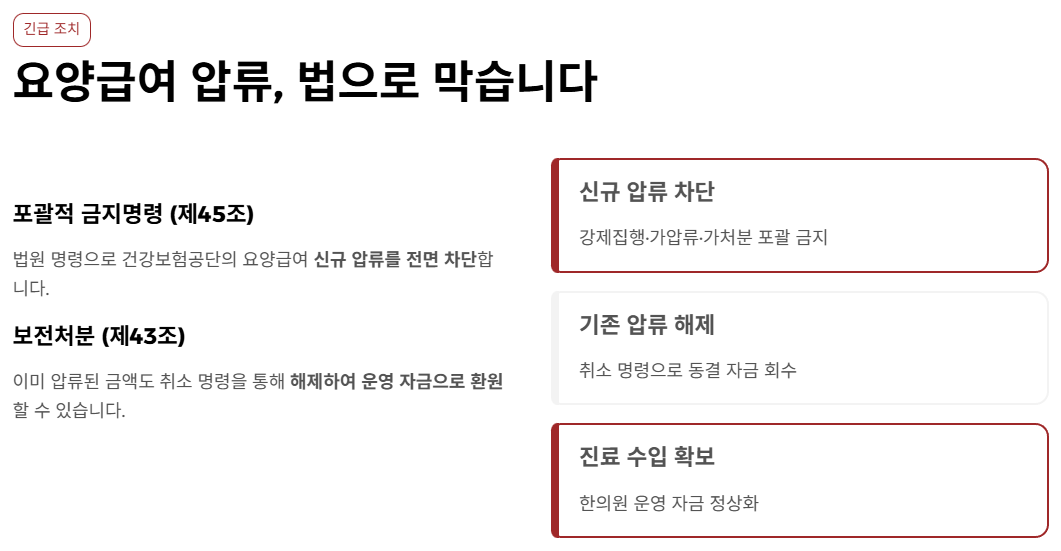 가장 시급하게 해결해야 할 '지혈' 작업입니다. 법원의 명령을 통해 건보공단의 요양급여 압류를 막고, 이미 압류된 금액도 절차를 통해 풀어내어 한의원 운영 자금으로 사용할 수 있도록 조치합니다.