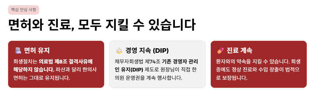 원장님, 가장 먼저 안심하셔도 좋다는 말씀을 드립니다. 회생절차는 파산과 달리 의료인 결격사유에 해당하지 않습니다.