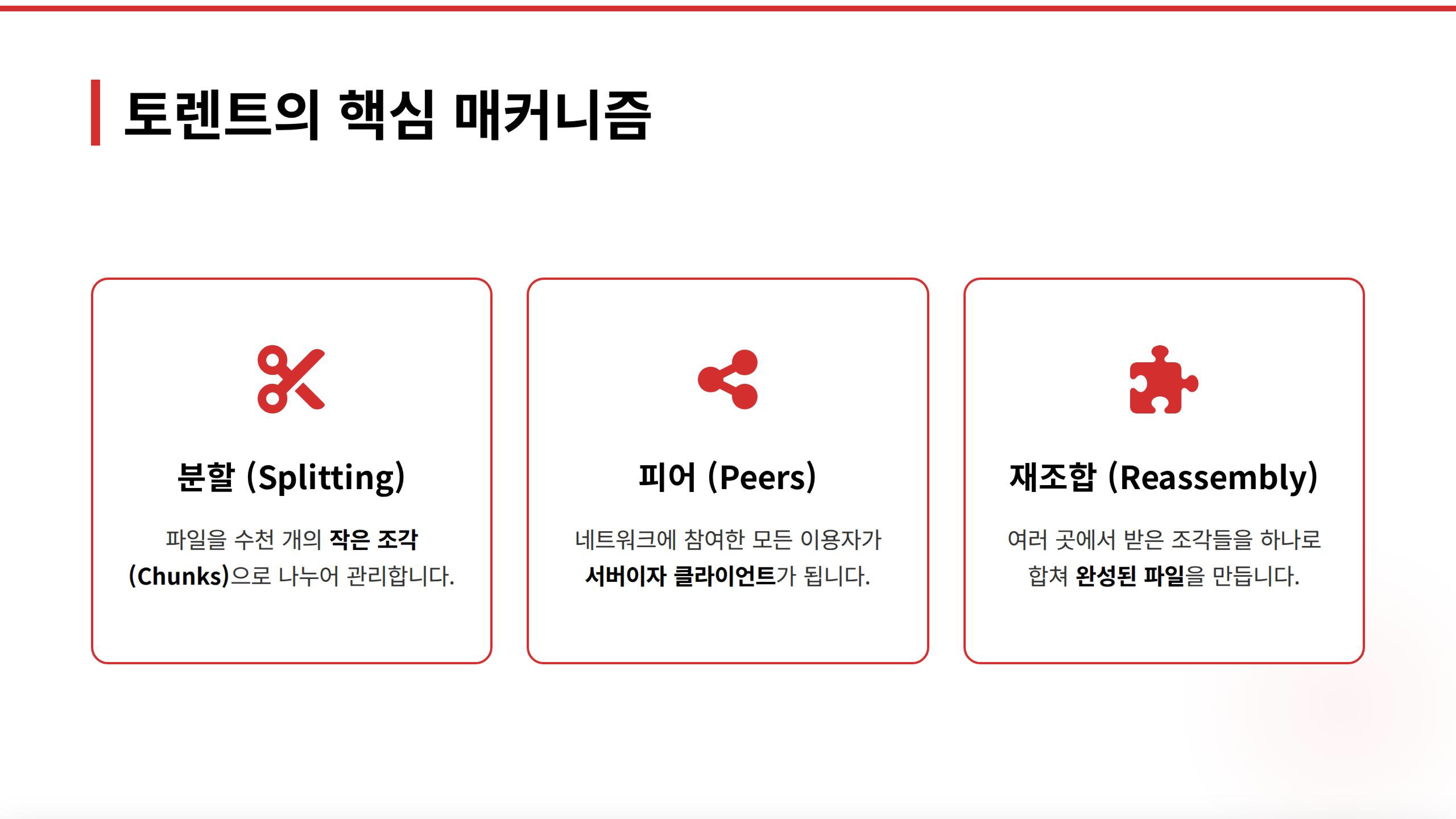 · 시딩(Seeding): 파일을 다 받은 후에도 프로그램을 켜두면 당신의 컴퓨터는 '시더(Seeder)'가 되어 불특정 다수에게 파일을 무한정 배포하게 됩니다. |